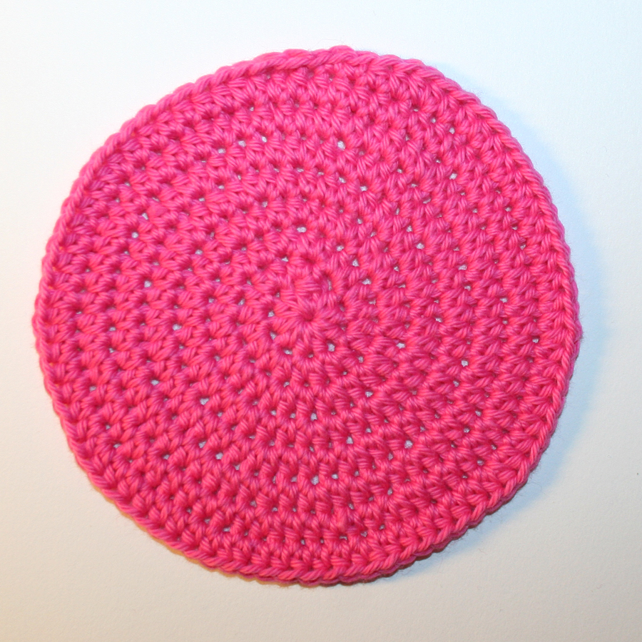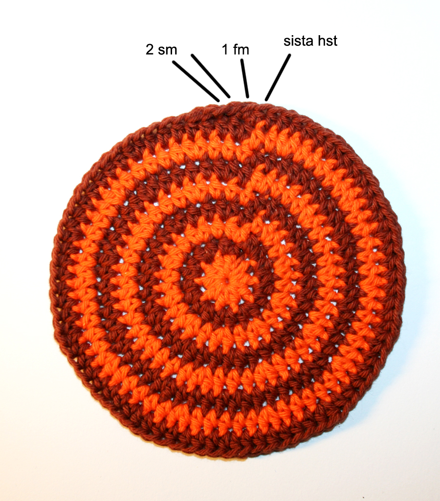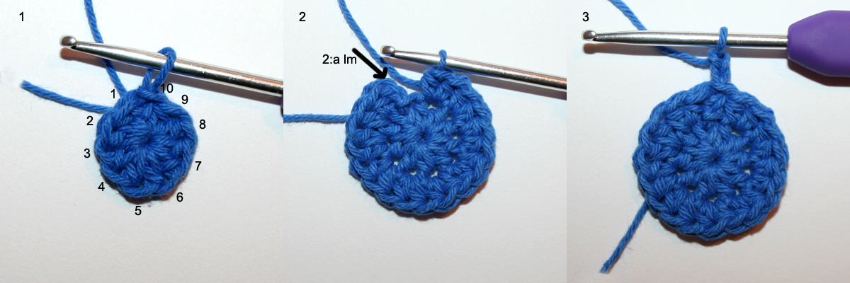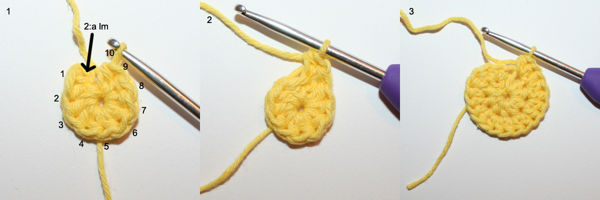 Varv 2: (ökning i varje m) 2 lm (= 1:a hst), 2 hst i var och en av följande 9 m, 1 hst i sista (tillsammans med de 2 lm blir det också en ökning), avsluta med 1 sm i 2:a lm = 20 hst.