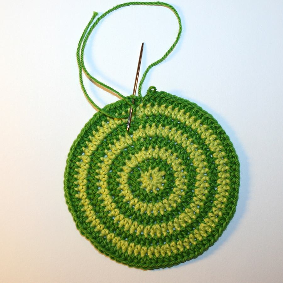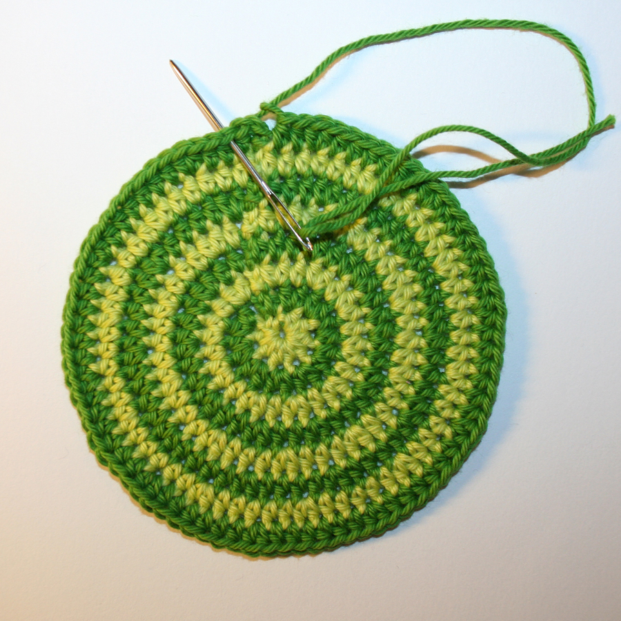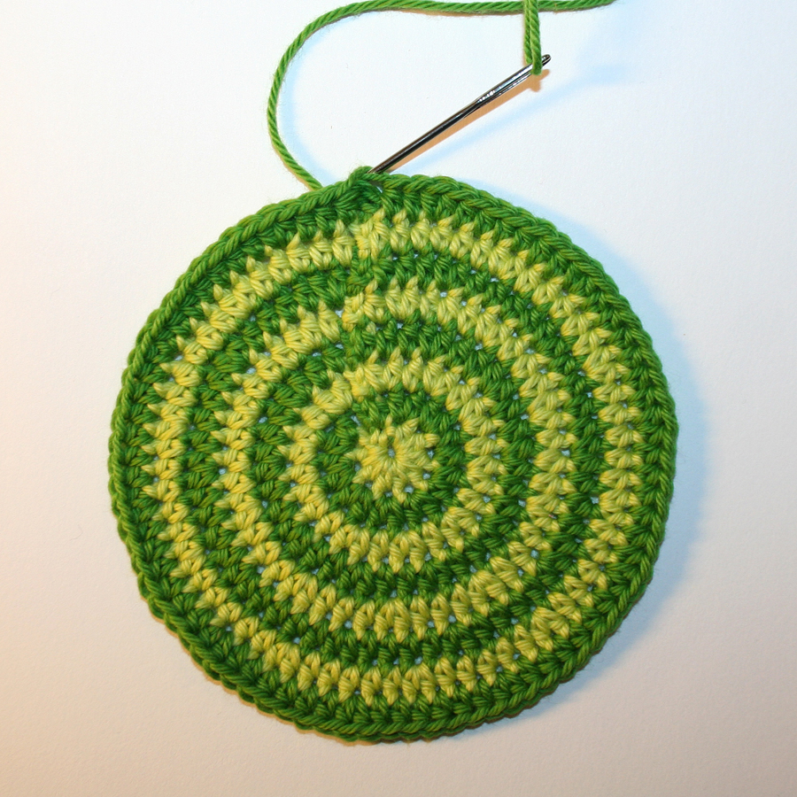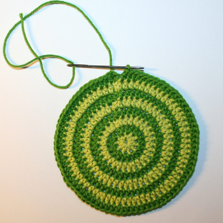 På sista varvet blir det en nivåskillnad och då kan man avsluta cirkeln med några mindre maskor så slutet formas bra. Här har jag virkat cirkeln med halvstolpar och avslutade med 1-2 fm och 2 sm