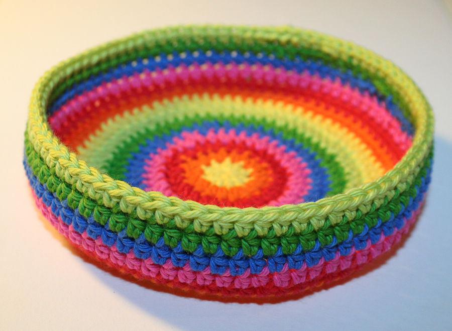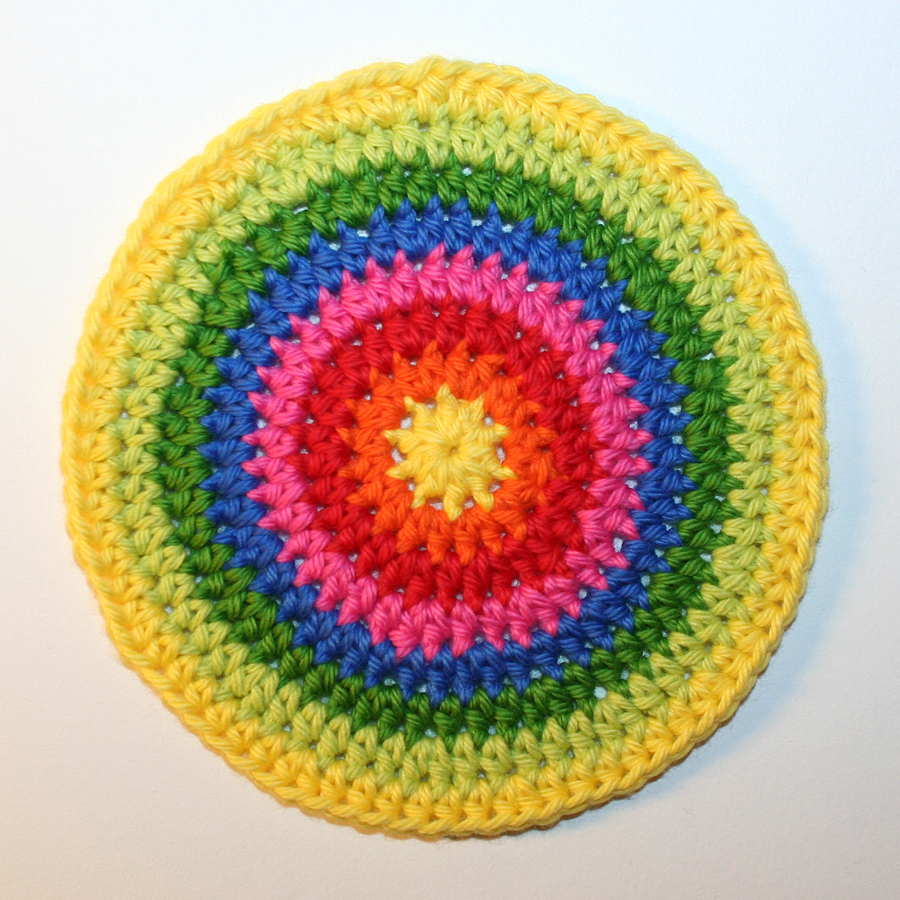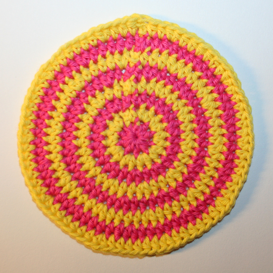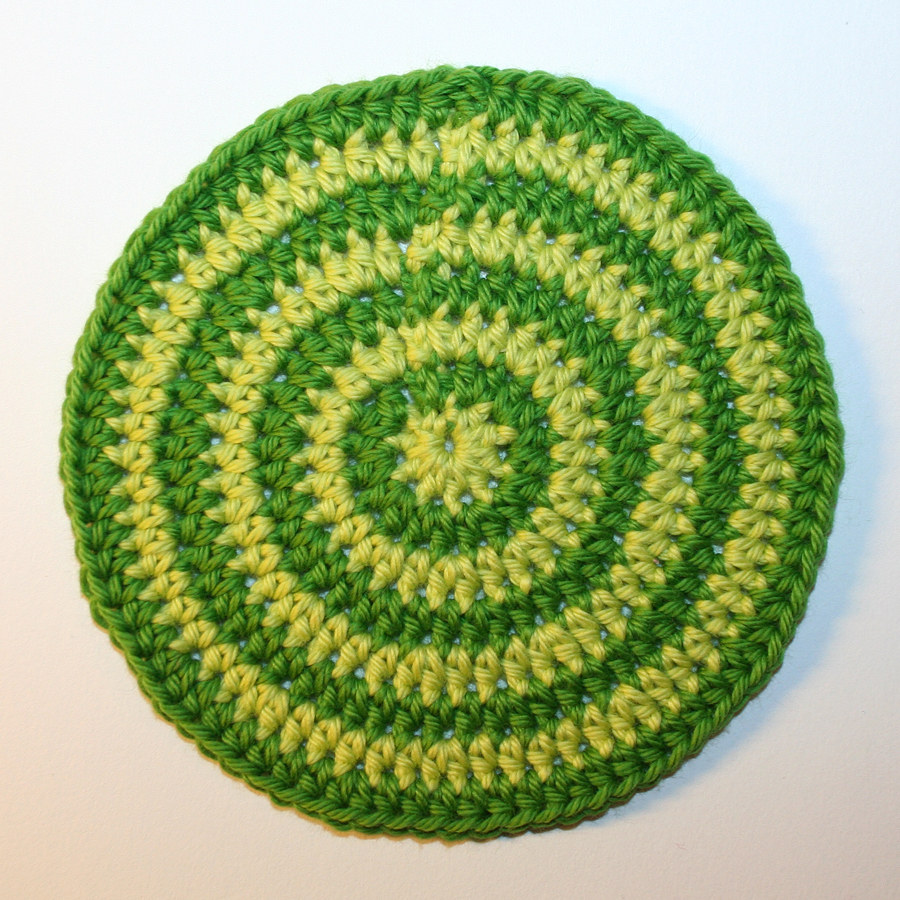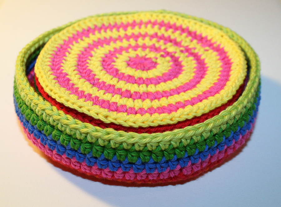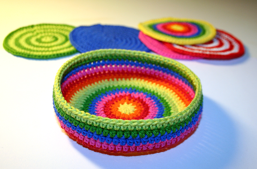 Du får först en genomgång av lite olika alternativ att virka i spiral för att få snygg form och fina färgbyten. Prova gärna alla sätt så du känner efter vilket som passar dig. Av detta kan du sedan göra trevliga glasunderlägg i olika färger samt en korg att lägga dem i.