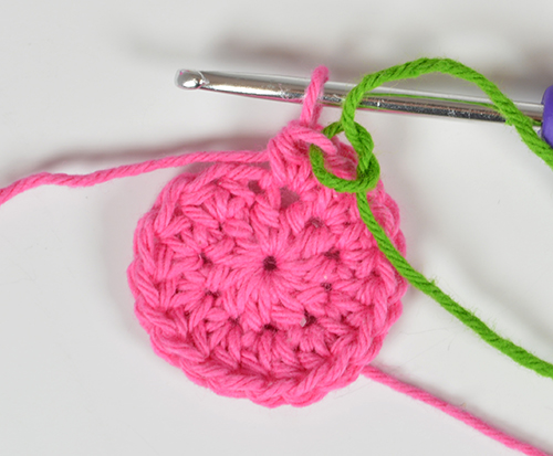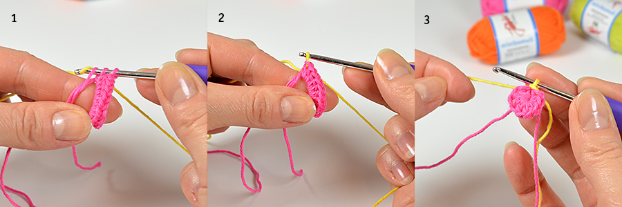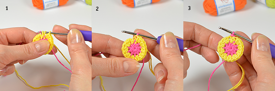 1-2. Gör sista genomdraget med nya färgen. 3. 1 sm. Fortsätt virka nästa varv med den nya färgen.