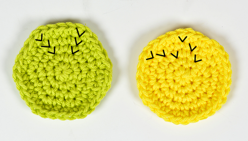 Ibland gör inte det nåt, ibland vill man kanske ha det så. Men om du vill ha rundare form så är ett bra knep att förskjuta ökningarna så de hamnar på lite olika ställen från varv till varv. På den gula nedan har jag gjort ökningarna på lite olika ställen. OBS! De är fortfarande jämnt fördelade över varvet, men skillnaden är att de inte hamnar rakt ovanför den förra ökningen.