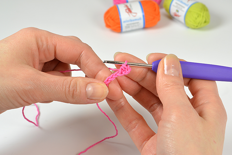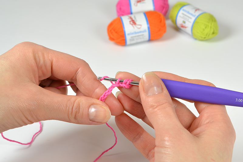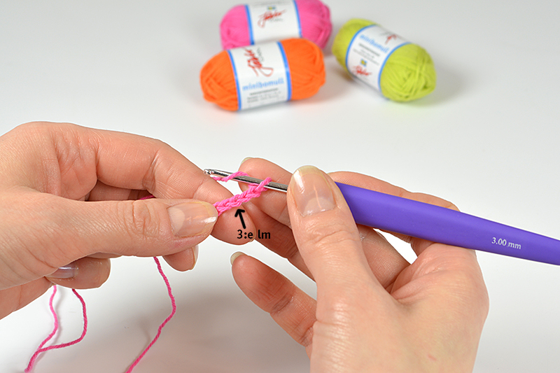 1. Varv 1 stängs med 1 sm i 2:a lm. 2. Varv 2 börjar med 2 lm och stängs med 1 sm i 2:a lm. 3. Varv 3 börjar med 2 lm.