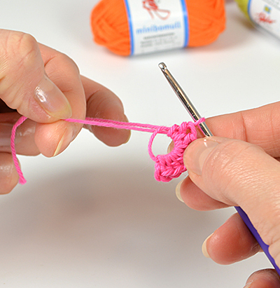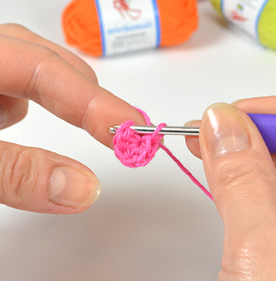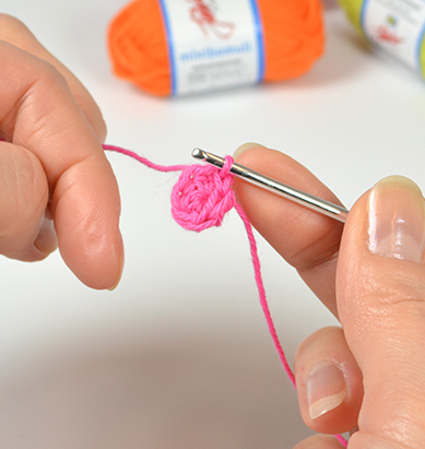 Varv 1: Gör en magisk ring med 2 lm (= 1 hst) och 9 hst = 10 hst.