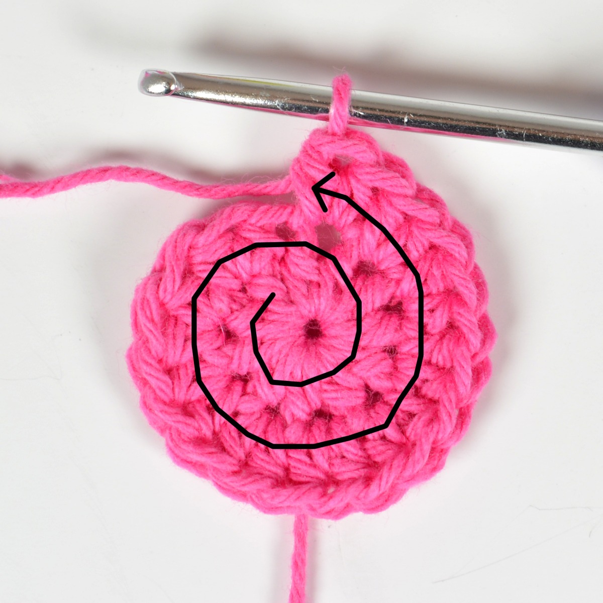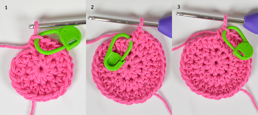 Tips: Det är lätt att tappa bort var varven börjar när man virkar i spiral utan avslutning på varven, särskilt om man virkar enfärgat. Då är det bra att markera varvets början eller slut, t.ex med en stickmarkör, säkerhetsnål eller bara sy in en liten garntråd i avvikande färg i första/sista maskan. Flytta sedan upp denna markör varje varv.