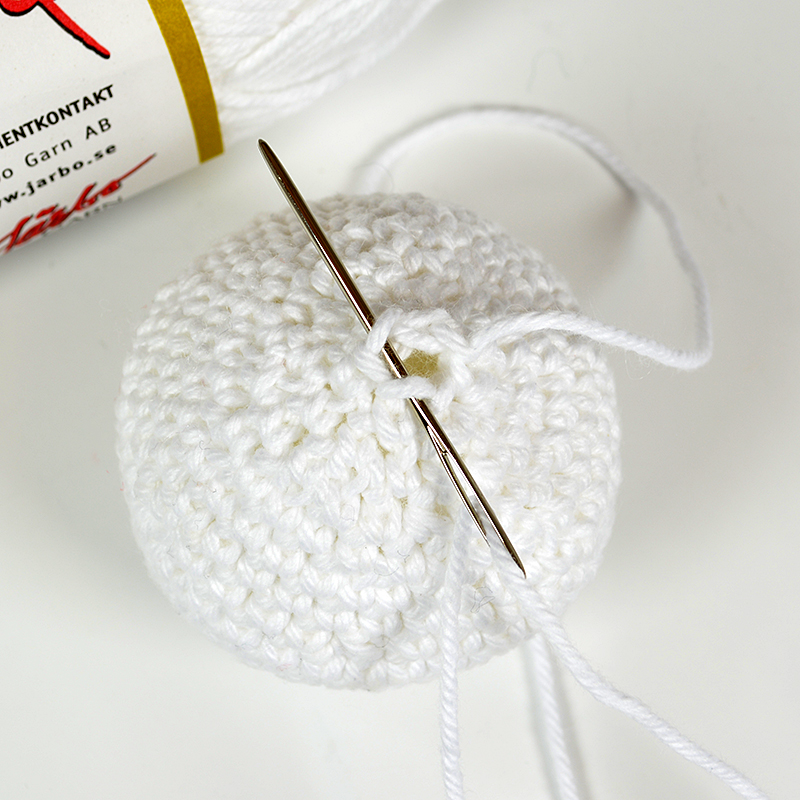 Använd tråden som är kvar och sy ihop överkroppen på underkroppen. Tips: Istället för att klippa av garnet där du sytt så stick nålen rakt genom bollen ut på andra sidan, dra lätt i tråden och klipp av så nära som möjligt. Då lägger sig tråden bra inuti.