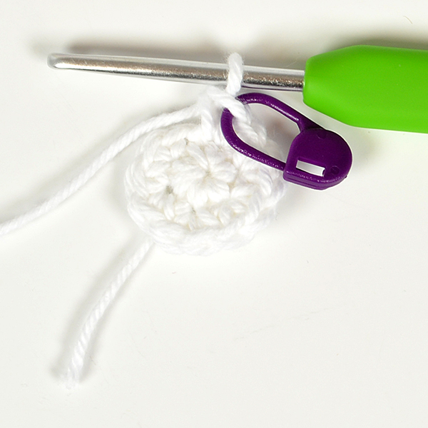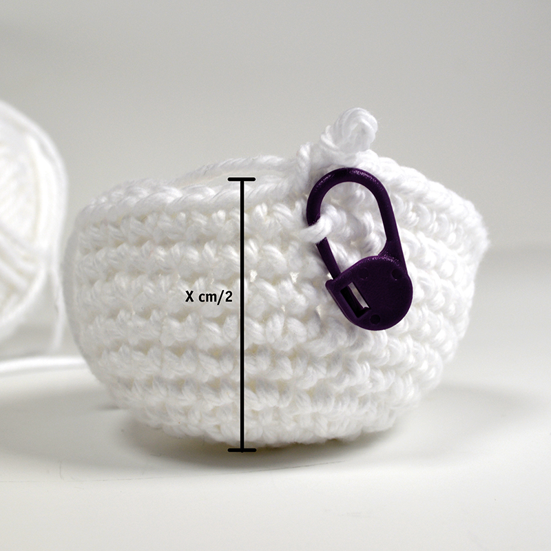 (Du kan låta markören sitta kvar i slutet på sista varvet med ökningar, så kan du räkna hur många varv efter denna du har virkat.)