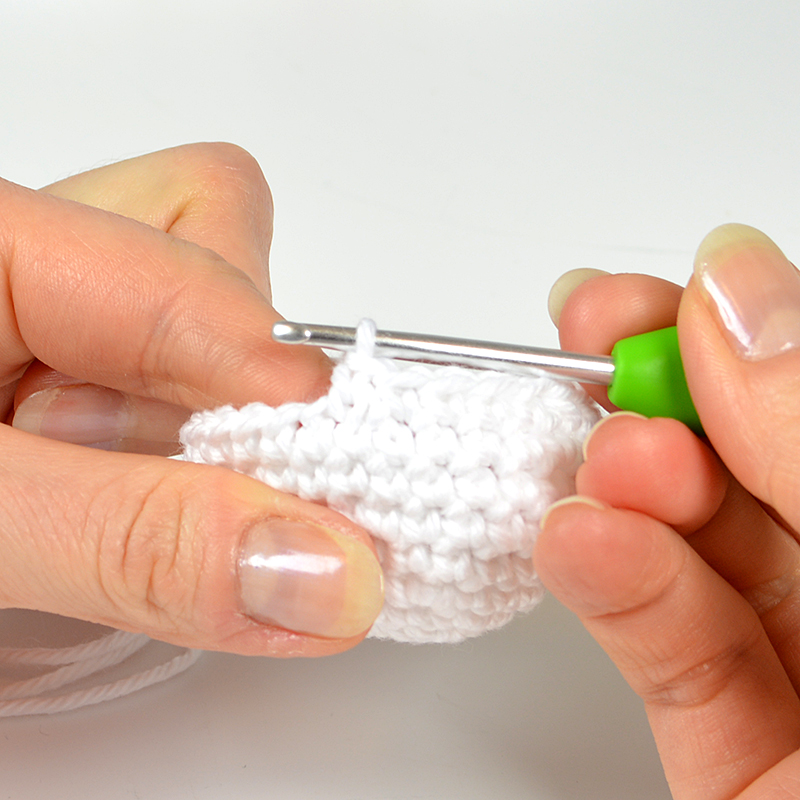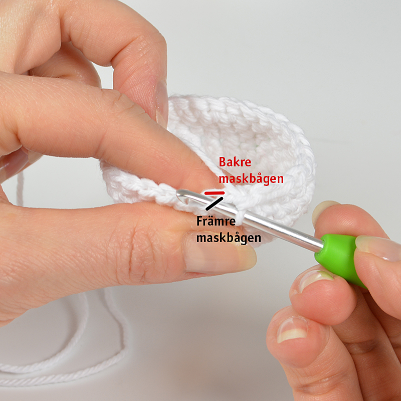 Varv 1: Gör en magisk ring med 2 lm (= 1 hst) och 9 hst = 10 hst.