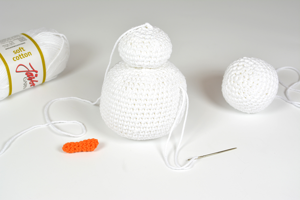 Om du nu vill fortsätta öva på bollar, kan du virka ytterligare två snöbollar av olika storlekar samt några andra delar och sätta ihop till en gullig snögubbe! Beskrivning nedan.