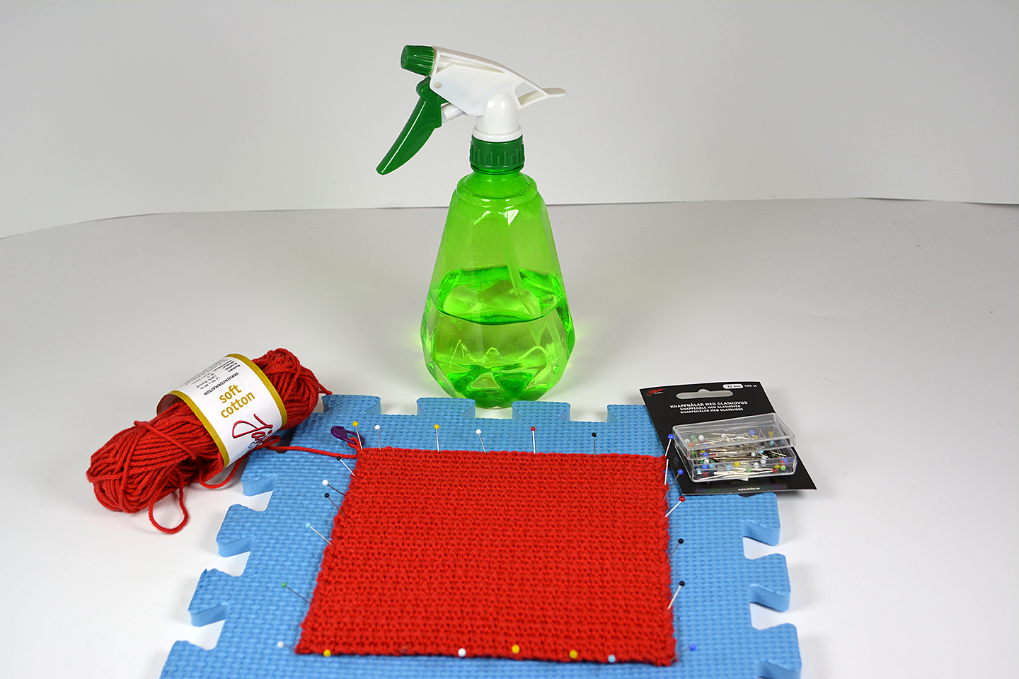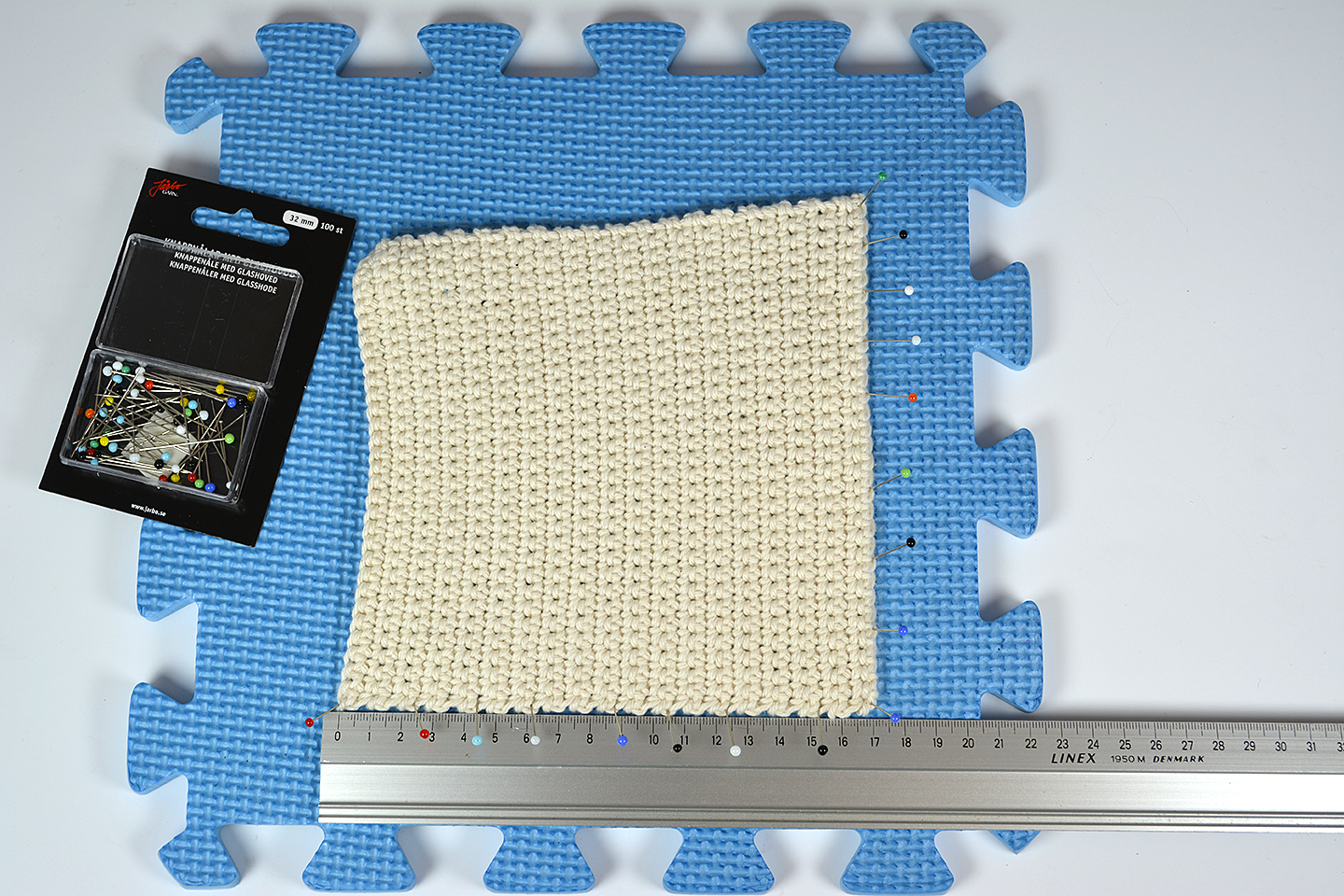 För att vara riktigt noga och få ett extra fint resultat kan du blocka rutorna (fukta och forma). Du behöver då knappnålar och nåt slags underlag. Det finns specifika blockningsmattor, men du kan även använda strykbrädan eller liknande, bara det är lite stabilt och håller formen. Du behöver en hård linjal och gärna en sprayflaska med vatten.