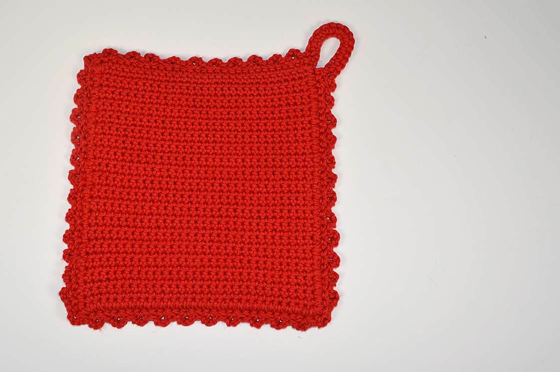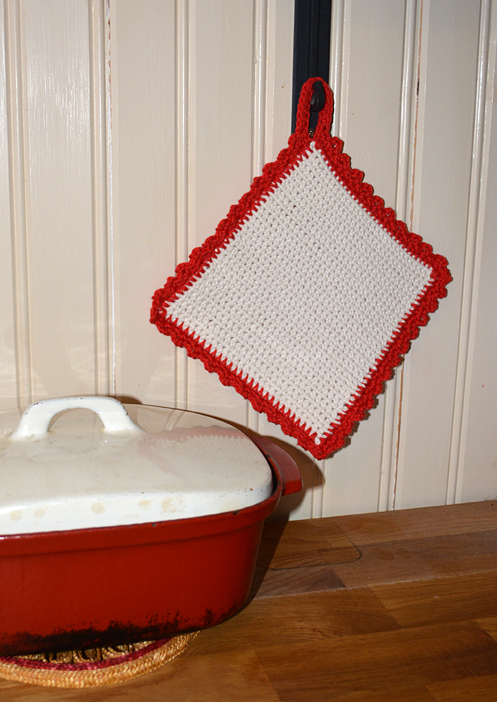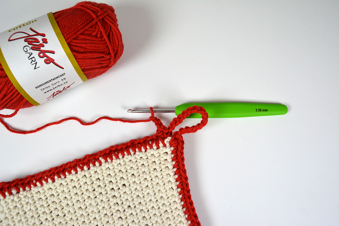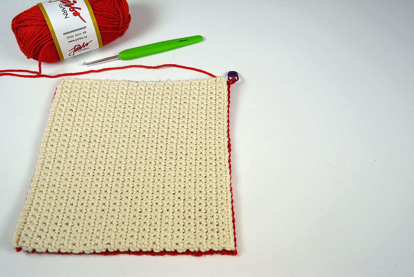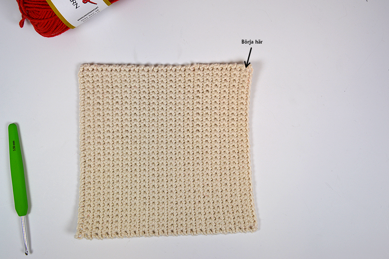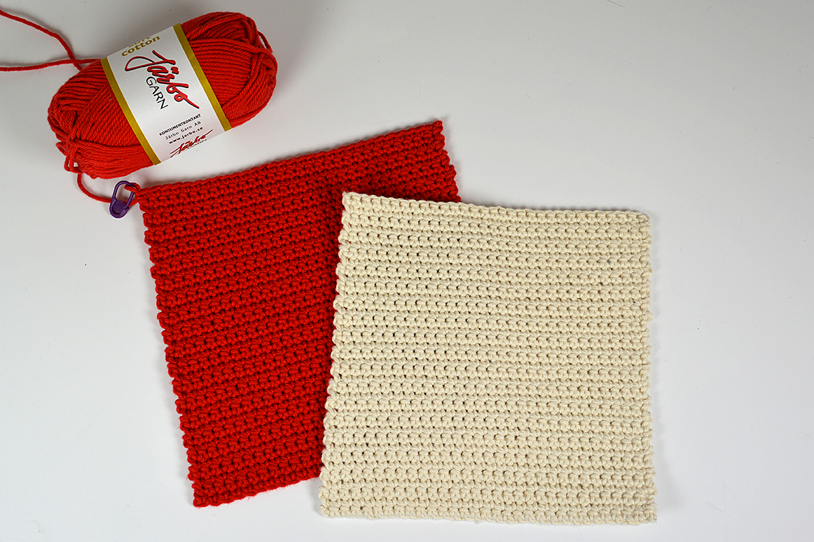 Tips: För att få en tjockare grytlapp virkar du en till likadan ruta. Varför inte i en annan färg? Se bara till att du gör lika många varv på de båda rutorna!