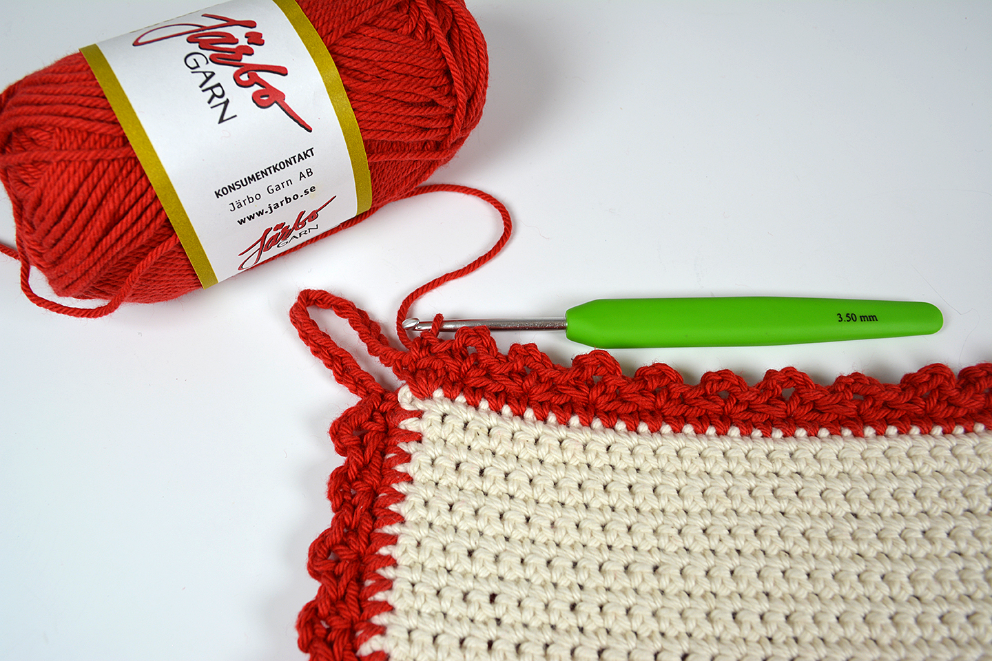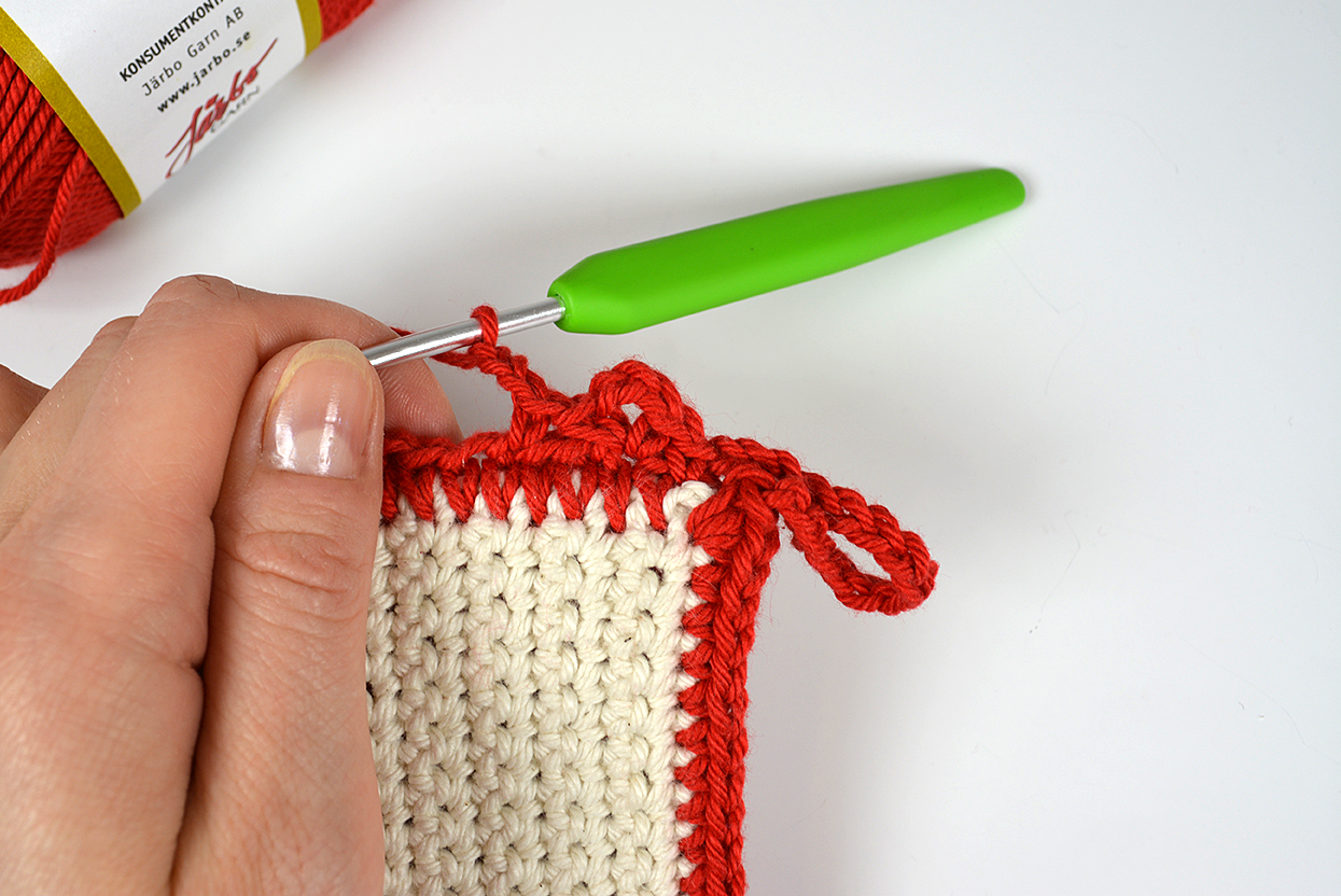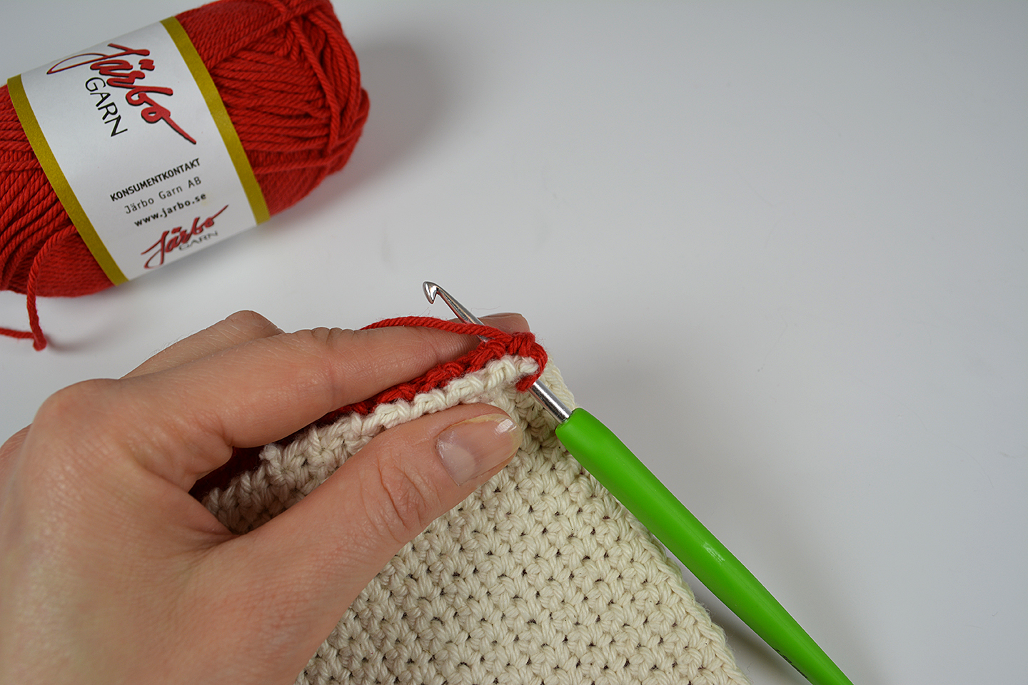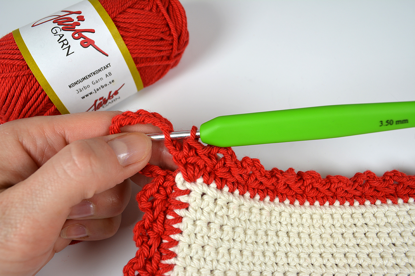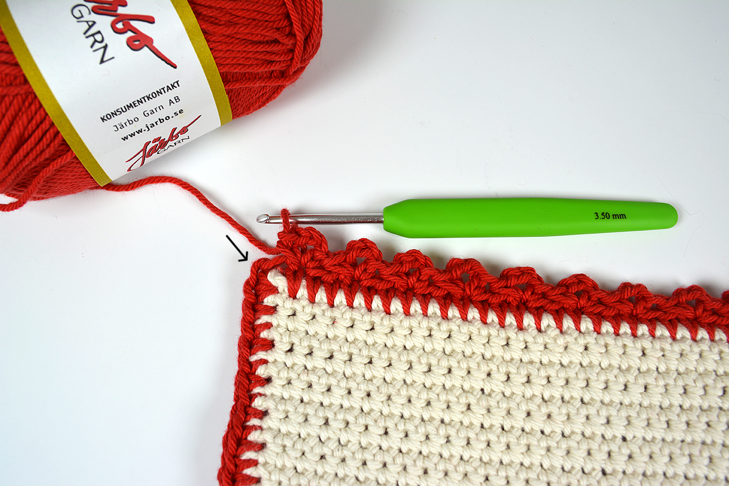 Här har jag inte tagit av garnet på den röda rutan, då kan jag bara fortsätta virka kanten med den öglan (se nedan).