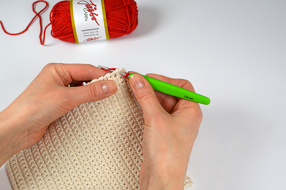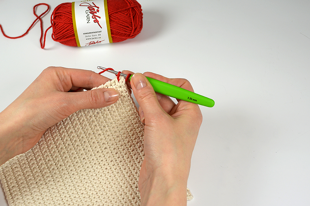 Fäst öglan med 1 fast maska i första varvets första maska.
