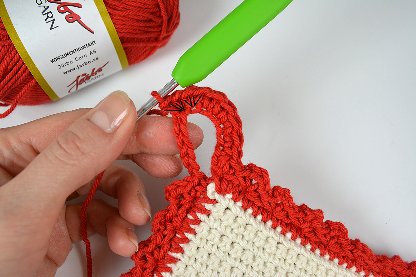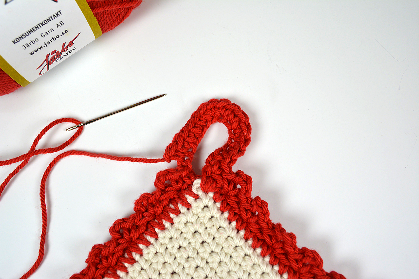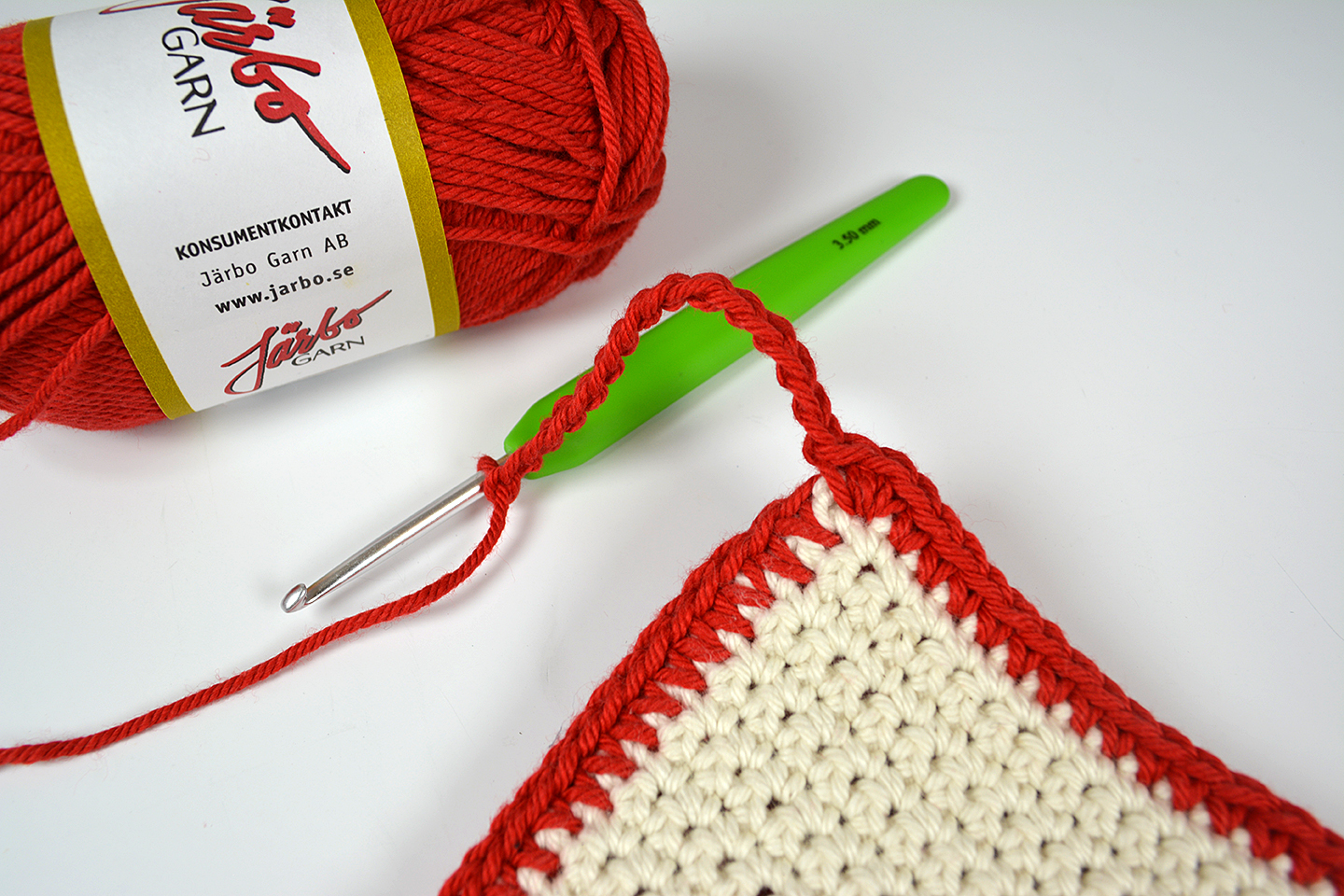 När du kommit runt till början gör du 3 fasta maskor i sista hörnet.