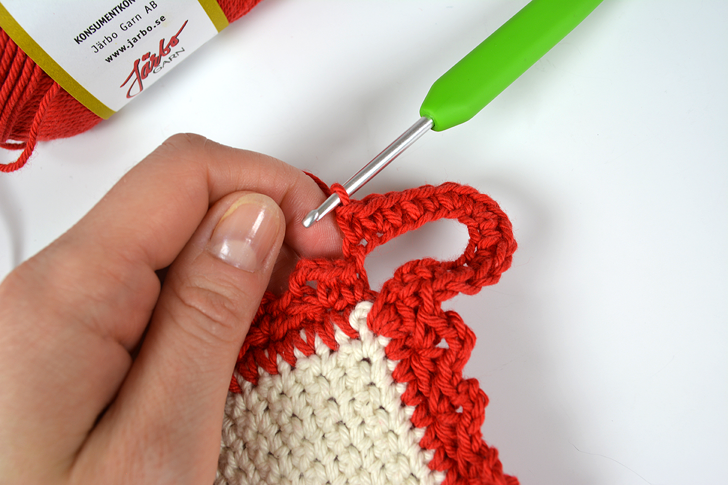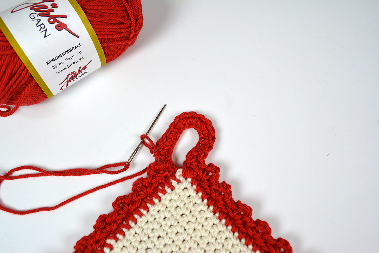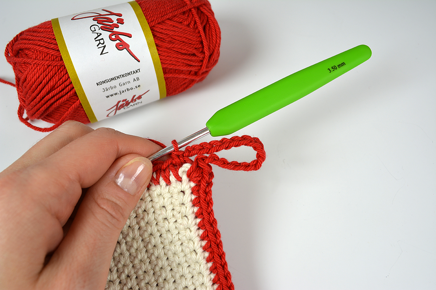 När du kommit runt till början gör du 3 fasta maskor i sista hörnet.