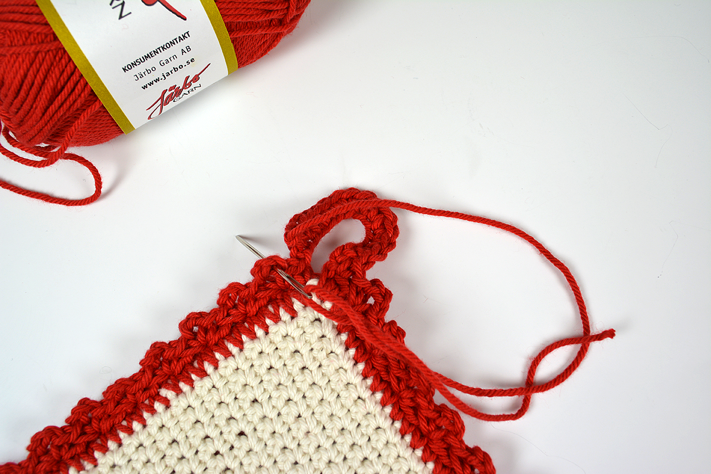 Här har jag virkat en naturvit ruta och fäst trådarna på den, samt en röd ruta där jag inte tagit av garnet, eftersom jag vill virka en röd kant sen.