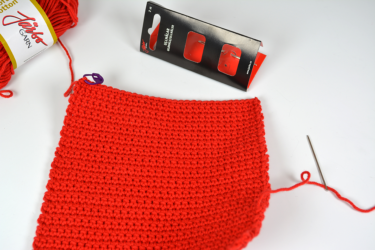 Fortsätt virka fasta maskor längs sidorna. Gör nedtag i varje varv yttersta maska och i varje maska på de andra sidorna. OBS! Dra upp öglorna ganska långt, så inte kanten stramar.