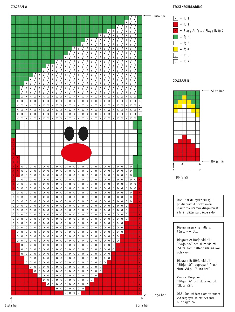 Gör en pom-pomboll med fg 1 och fg 2 ca 2½-3 cm i diameter (eller valfri storlek) enl förkl. Sy fast den i toppen av mössan. Om man inte vill göra en boll, kan man brodera en boll med plattsöm. Använd 1 tråd fg 1 och 1 tråd fg 2. Brodera konturer utmed mössans kanter med fg 8. Brodera snöflingor enl förkl och skiss med fg 9, eller efter eget önskemål. Sticka ihop höger axelsöm enl följ: Du behöver 3 stickor. Sätt bakst axelm på en st 3 mm och framst axelm på en st 3 mm. Håll bägge stickorna i vänster hand med avigsidorna utåt. Sticka ihop första m från varje sticka = 1 m på höger sticka. Gör samma sak med nästa par m från stickorna i vänster hand och drag den första ihopstickade m över den andra ihopstickade m. Fortsätt på samma sätt v ut. Halskant: Plocka från räts med st 3 mm och fg 2 upp ca 69 m runt halsringn och sticka resår 1 rm 2 am innanför kantm i varje sida. OBS! Första v blir från avigsidan och då börjar resåren med 1 am 2 rm. Sticka 5 v och maska av i resår. OBS! Gör ett knapphål mitt på kanten i början av resåren så att den stämmer överens med knapphålen på axeln. Ärmar: Brodera maskorna på första varvet i vitt i zickzackmönstret med fg 7. Brodera maskorna på första varvet med grönt i zickzackmönstret med fg 9. Använd maskstygn, se förkl. Mät ut ett ärmhålsdjup på fram och bak till ca: 13½ cm. Sy i ärmarna. Sy ihop sid- och ärmsömmarna. Använd kantm till sömsmån. Tänk på att rullkanten nedtill viker sig utåt så att du syr ihop från andra sidan. Sy i knappar på resårkanten på ryggens axel.