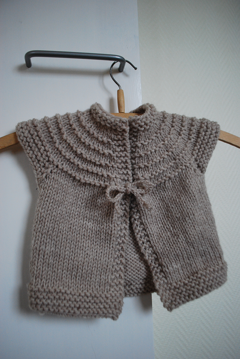Trots sitt lite otympliga namn blev den en av Kyrkkaffebloggens populäraste stickbeskrivningar, och den hamnade på omslaget till boken Sticka & skicka, och bebisar i både Sverige och många andra länder har fått den i födelsepresent. Kalle på Järbo har bett Libris förlag om tillstånd att publicera den här. Den är helt enkelt en ärmlös variant av den populära Femtimmarskoftan, som stickas uppifrån och ner med massor av ökningar i oket, och ärmkanten har fått några rätstickade avslutningsvarv.