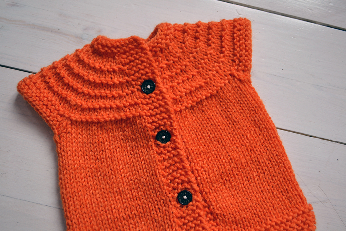 Det har blivit dags för en variant av Treochenhalvtimmesvästen. Den har ju tre maskor breda framkanter och är enklast att knäppa med virkade knytband eller med en knapp och en virkad ögla, men gör man framkanterna fem maskor breda istället får man plats med en knapphålsrad.