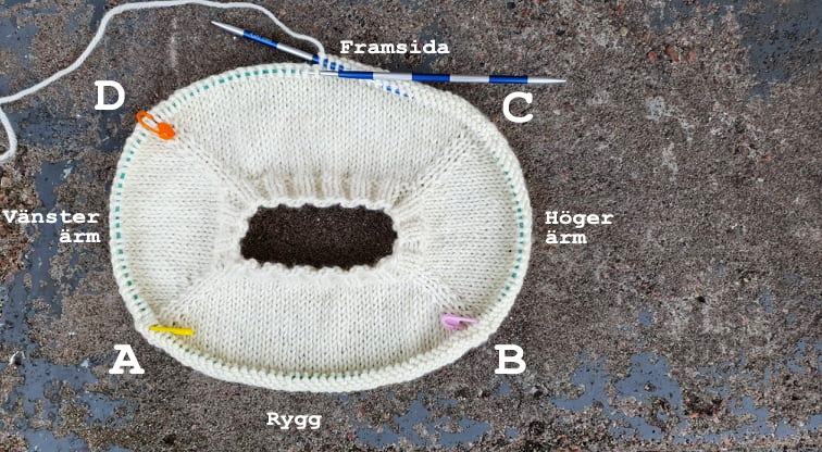 Oket stickas runt med 8 ökningar vartannat varv. Du gör alltid dina ökningar på respektive sida om vardera markör. Du ska alltid ha samma maskantal på höger och vänster ärmdel och det ska även vara lika många maskor på bakstycket/ryggen som på framstycket. Det är lätt att kontrollera om du missat en ökning eftersom att maskantalet då kommer att skilja sig. På bilden nedan ser du de fyra markörernas placering. Markör A visar varvets början och bakre vänster axel. Bilden visar ett färdigt ok i stl 50-56.