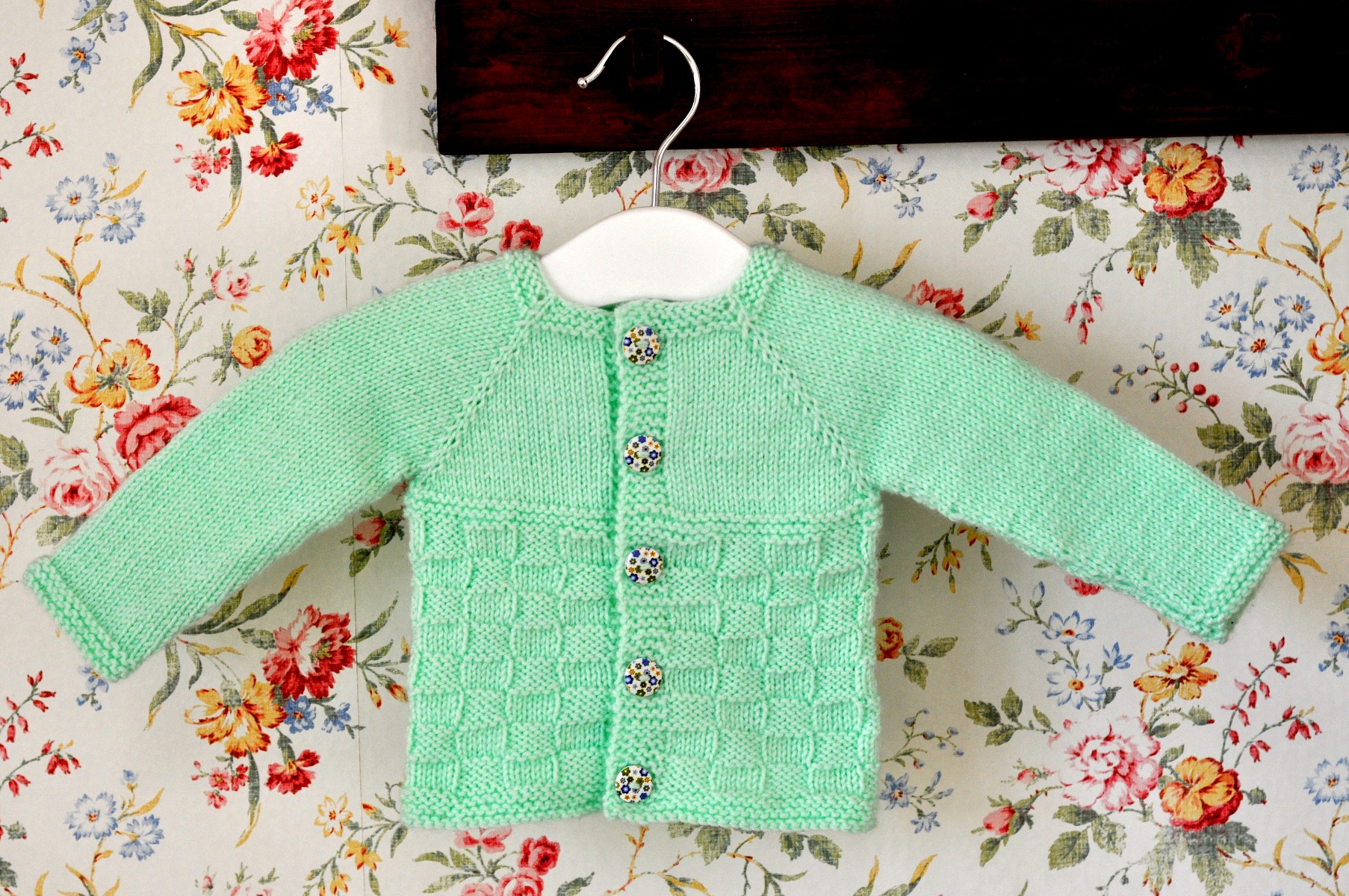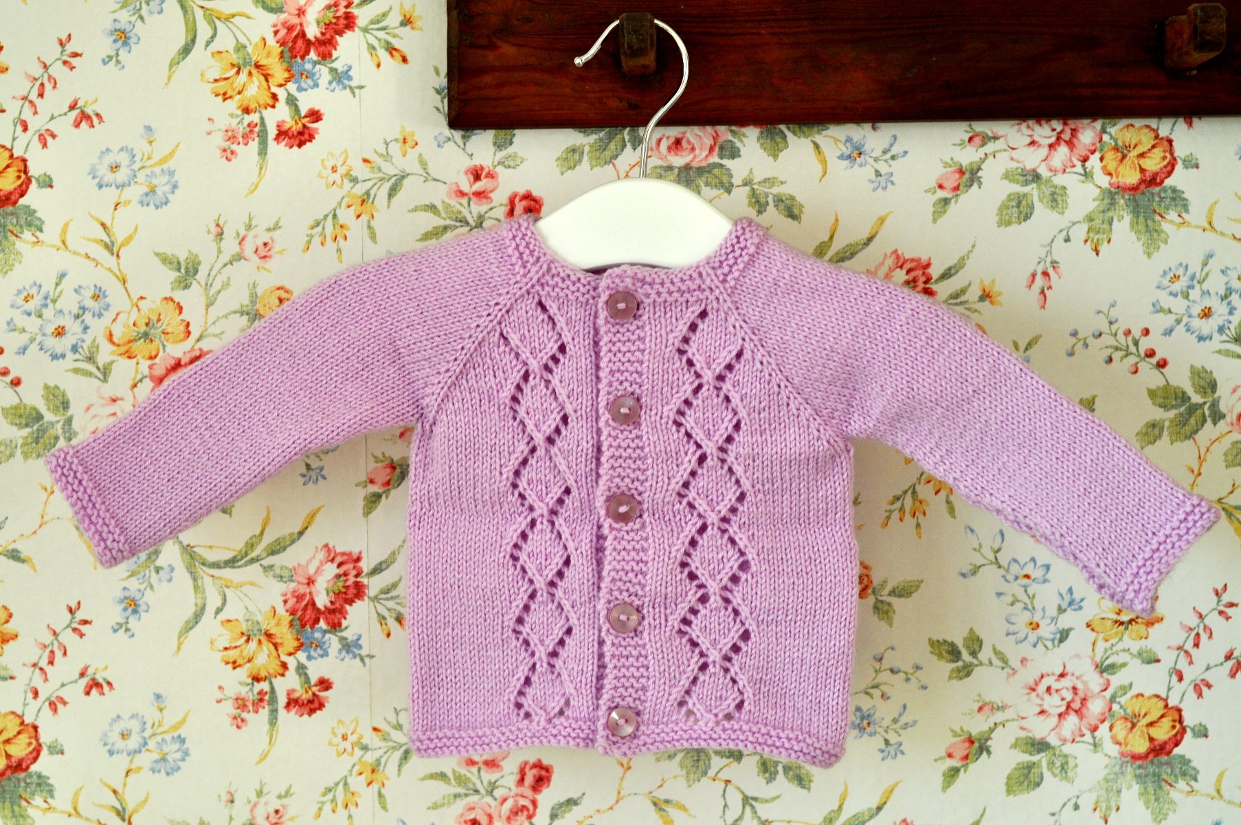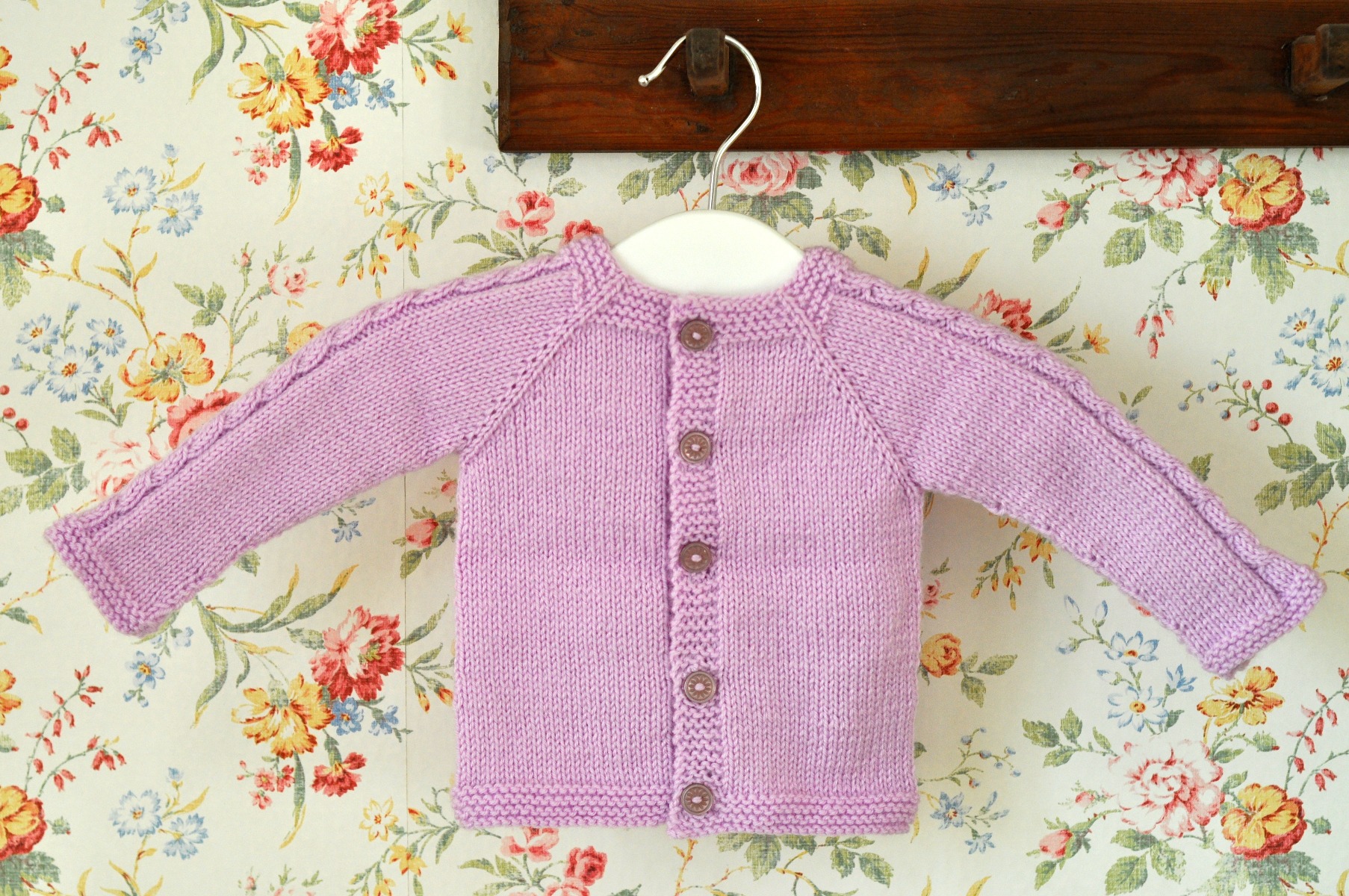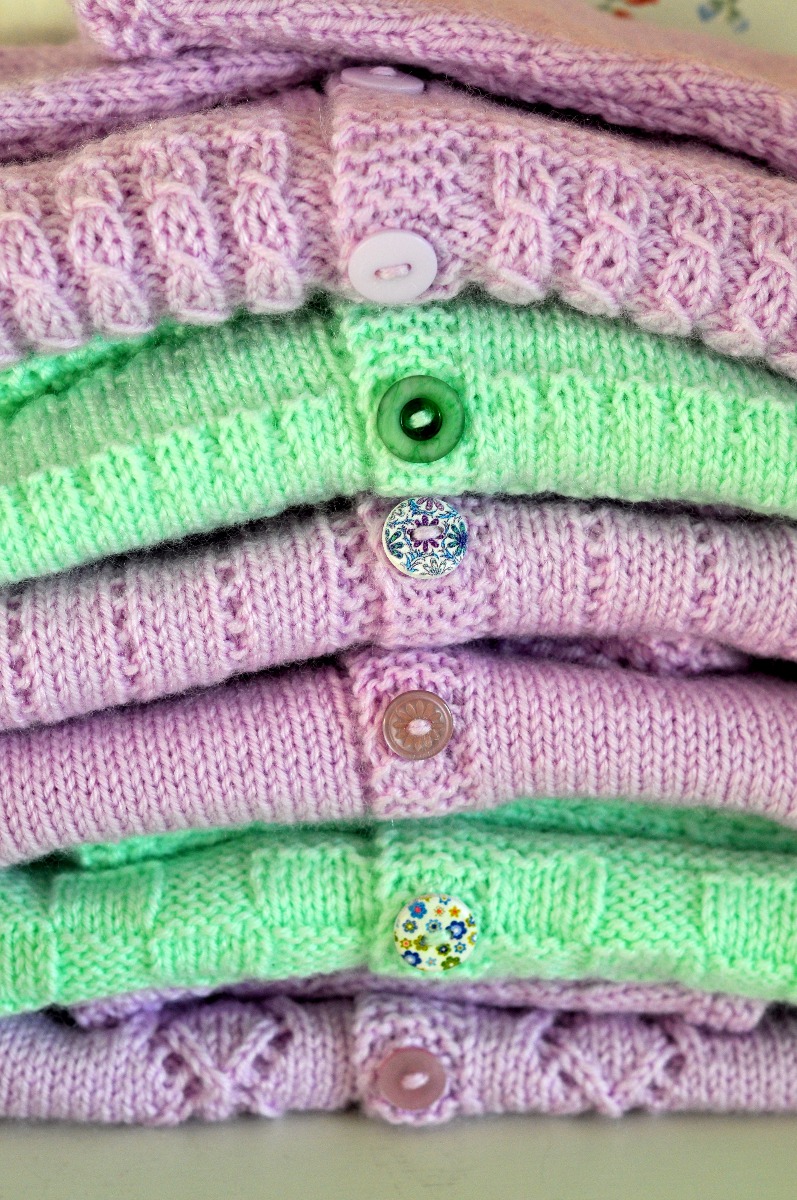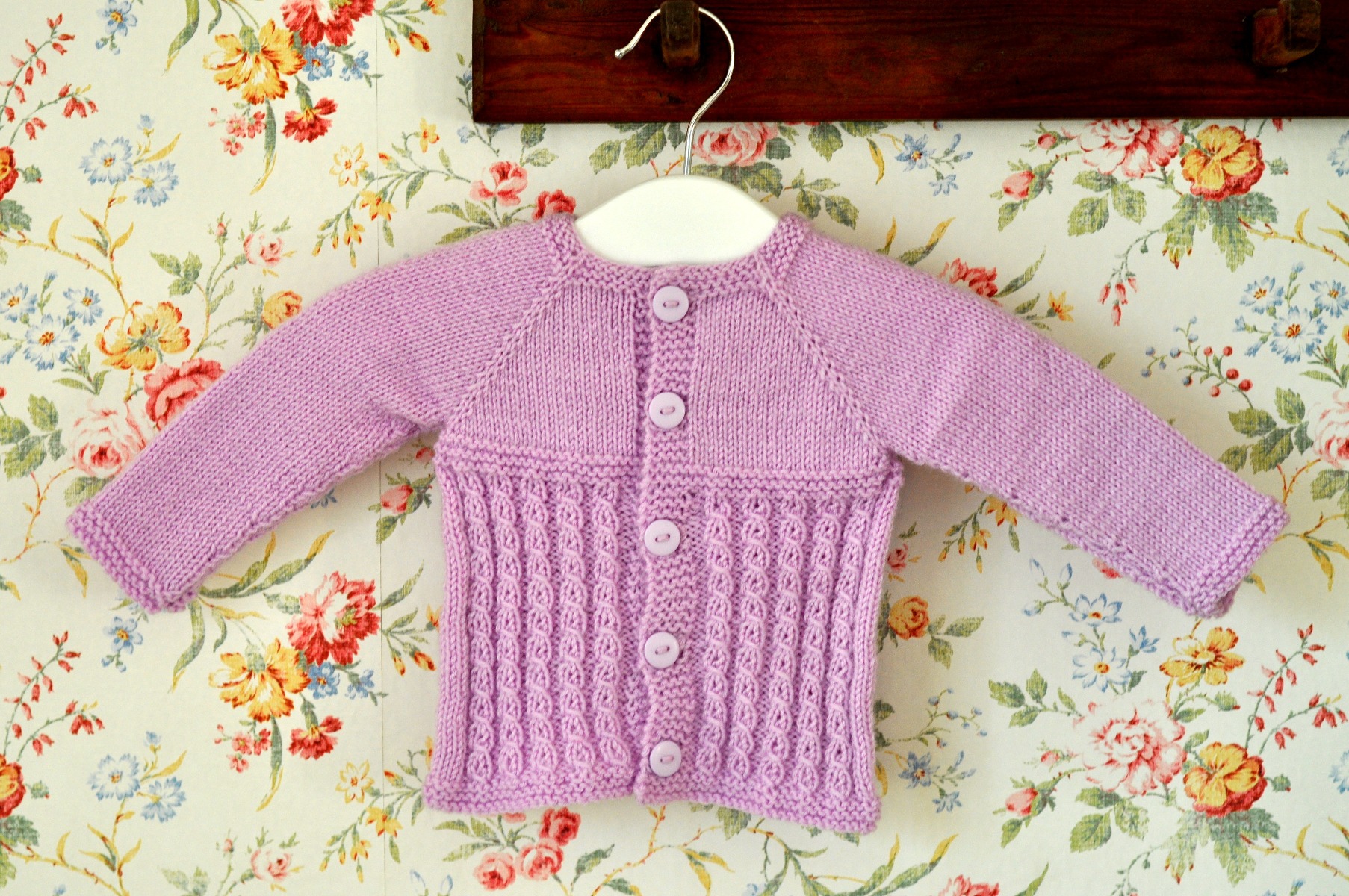 Den här koftan har fått ”falska flätor” (ur Margaret Huberts Stora boken om stickning) på framstyckena.