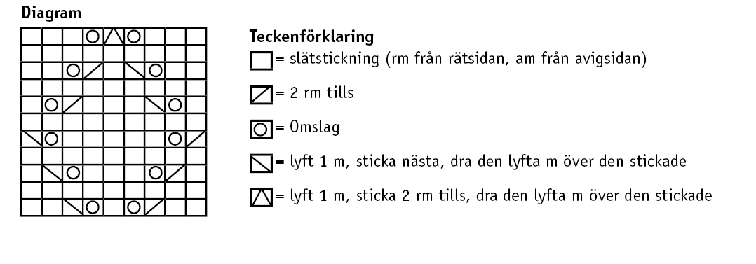 Varv 4: 2 am, *lyft 1 m, 2 rm, dra lyft m över 2 rm, 2 am, repetera från * varvet ut.