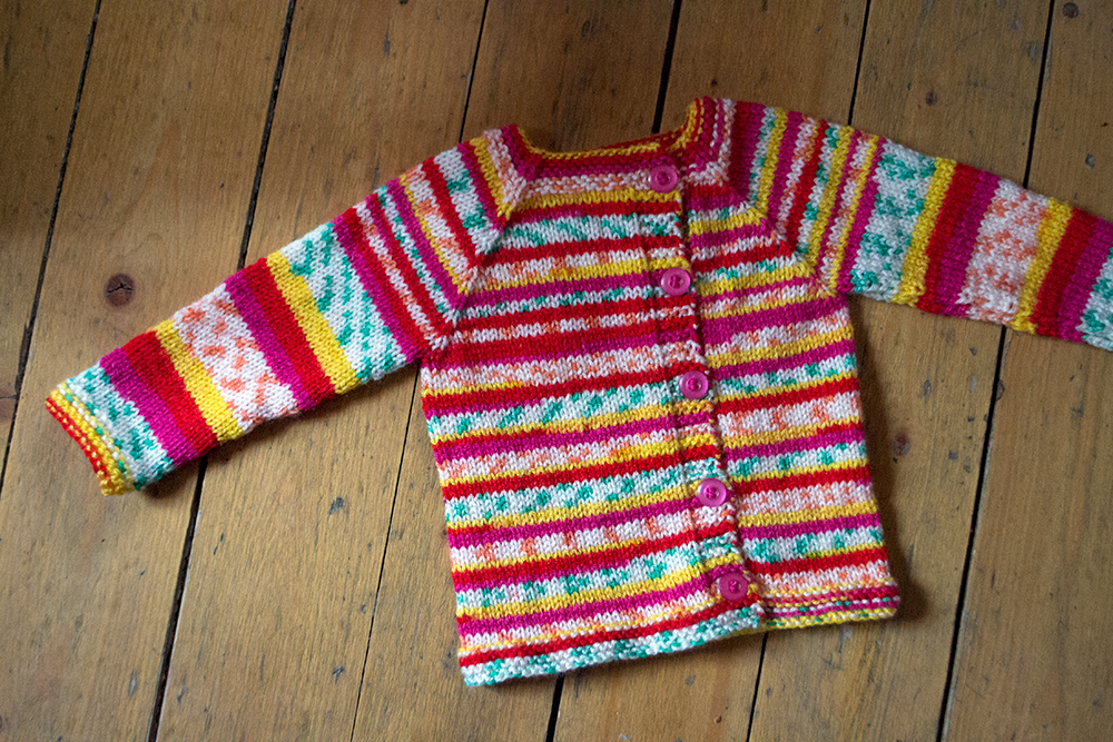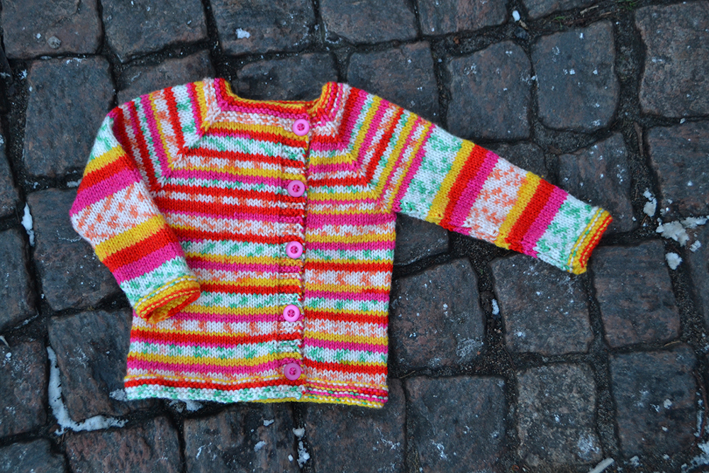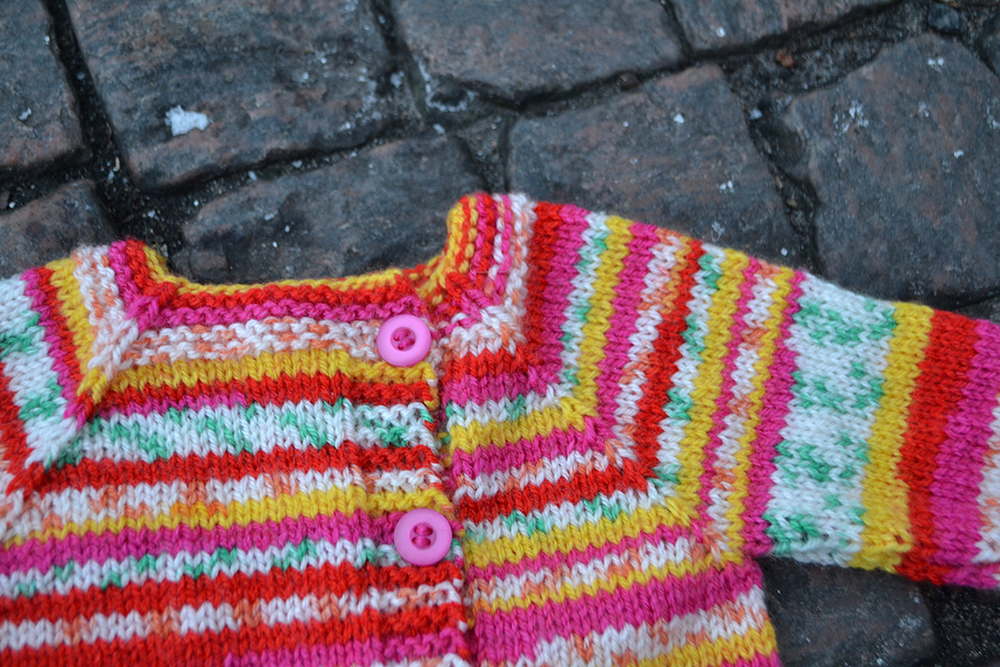 Fäst de båda trådändarna. Sy i knappar, knäpp och ge eller skicka koftan till någon som behöver värme!