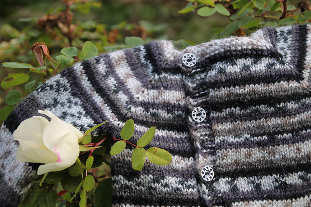 En av de modeller som uppstod någonstans i mitt huvud då, och som jag var tvungen att testa, var en Två trådändars lilla kofta med knäppningen förskjuten till ena sidan. Det är en minimal ändring, det går åt exakt lika mycket garn och exakt lika många knappar, men koftan får en lite egen karaktär som jag tycker är charmig och kanske en aning … japansk?