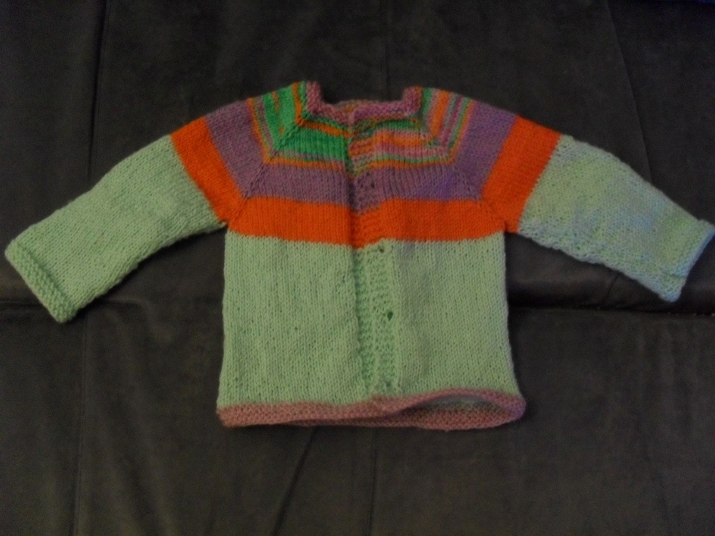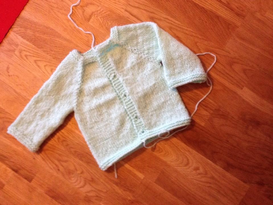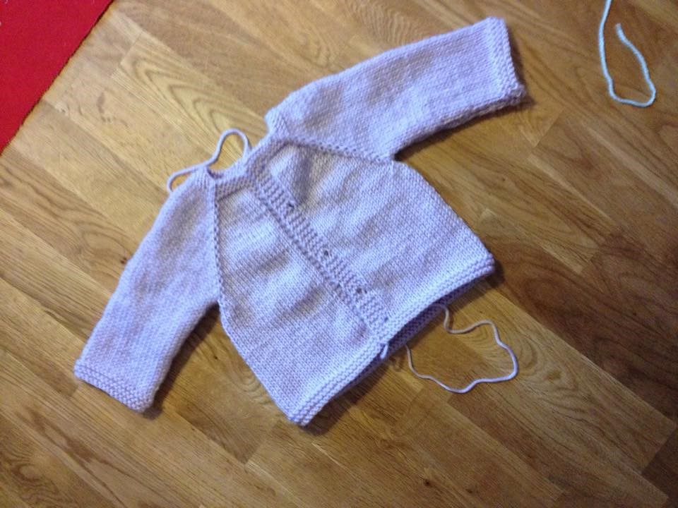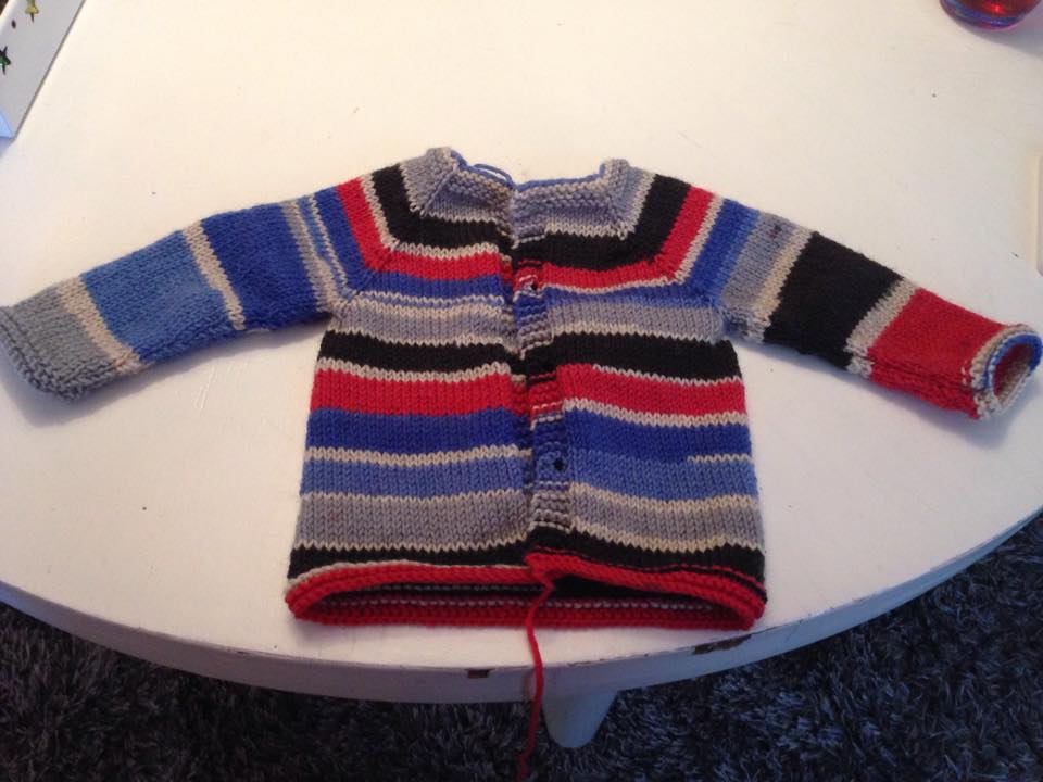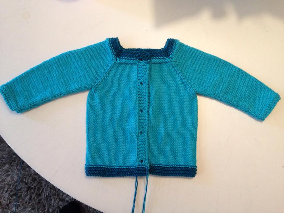 Här är Annikas första kofta. Den fick ett par extra räta varv upptill och nertill (och ett par extra trådar att fästa).