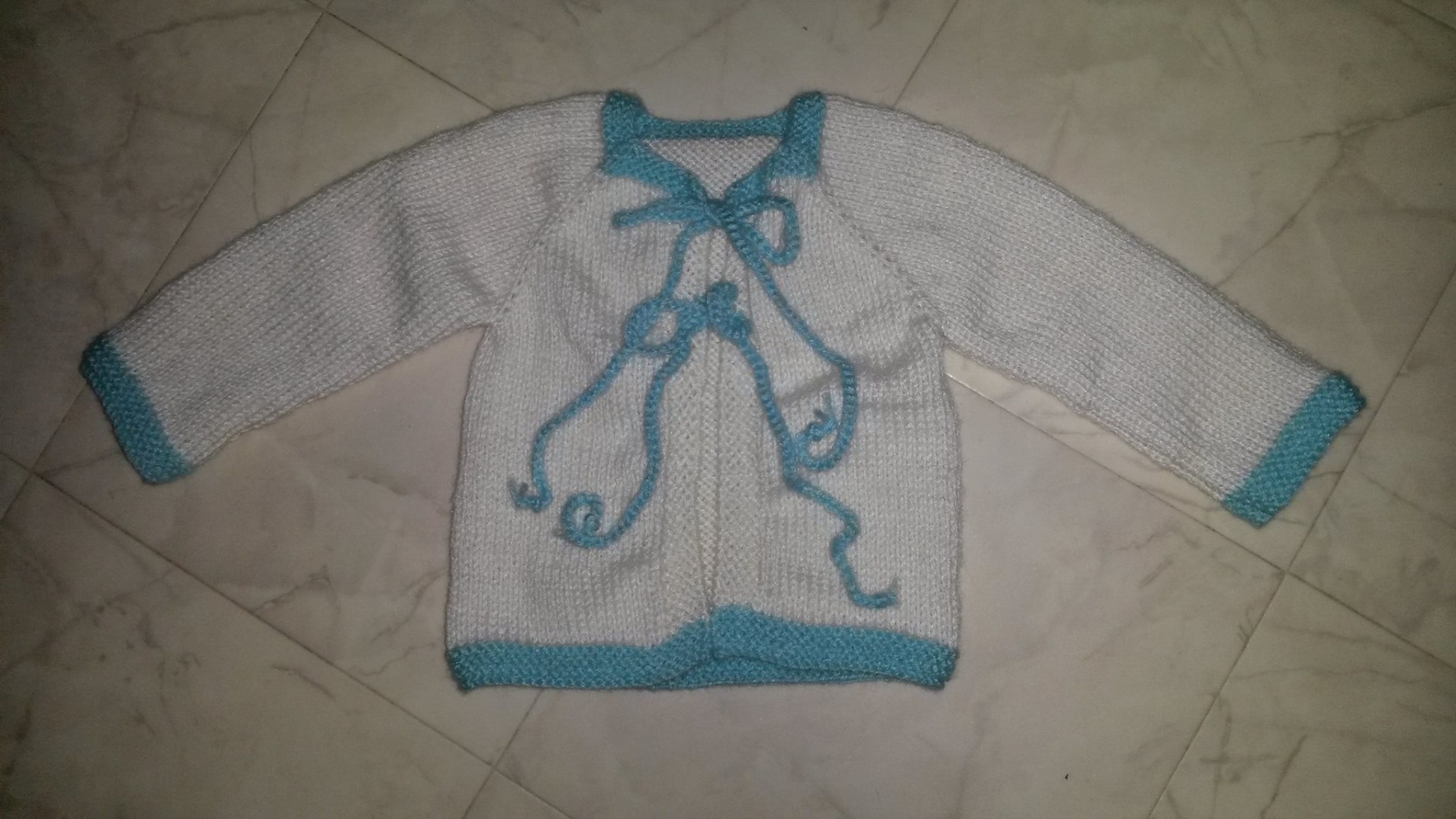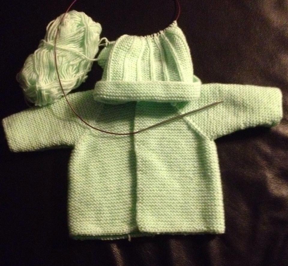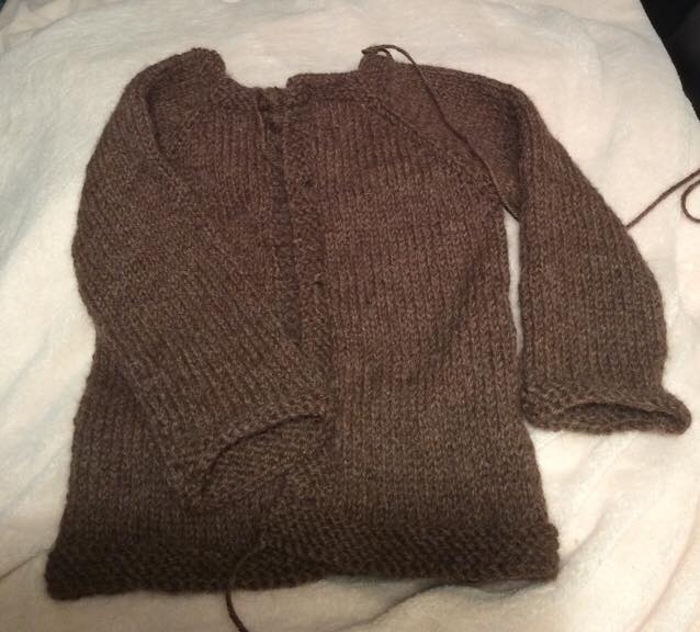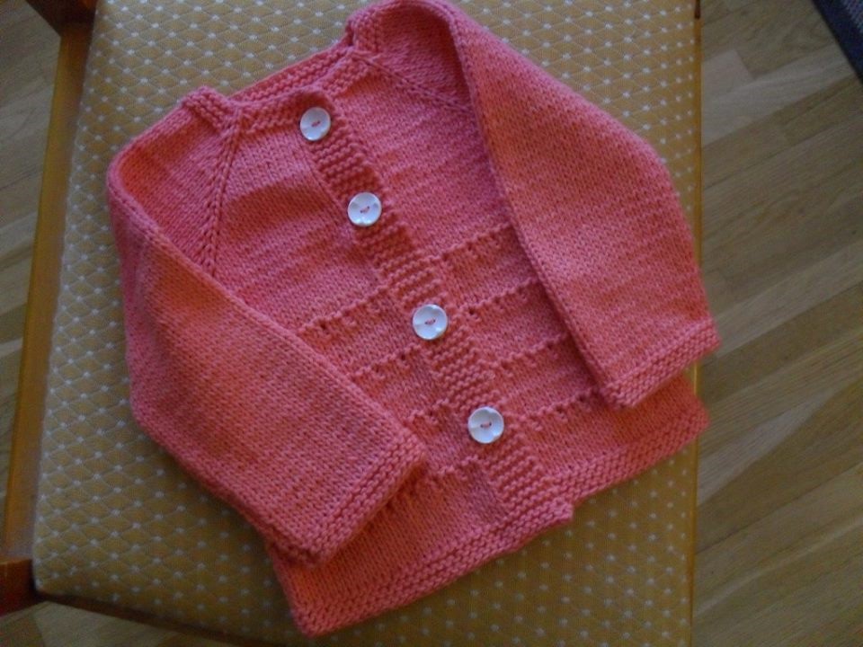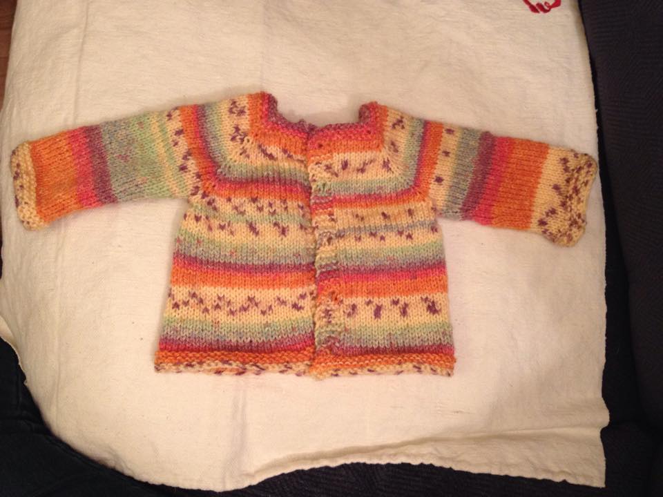Här är Annikas första kofta. Den fick ett par extra räta varv upptill och nertill (och ett par extra trådar att fästa).