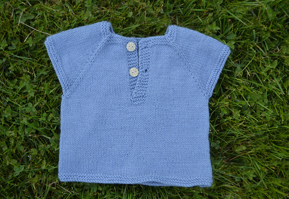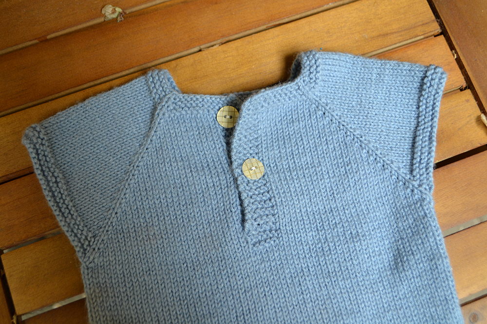 Fäst de båda trådändarna. Sy i knapparna. Grattis – du har stickat en liten slipover!
