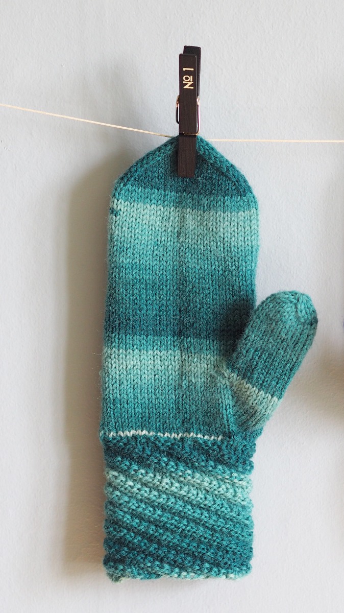 Lägg upp 3 nya maskor vid tummen och fortsätt sticka slätstickning i 9 cm (eller önskad längd).