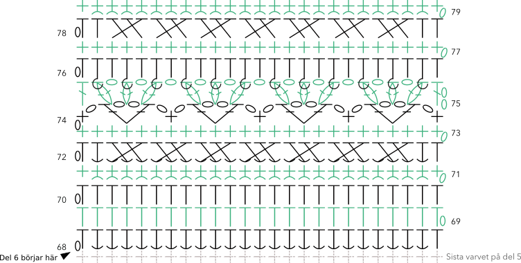 Vi börjar med färg B. Håll arbetet med avigsidan mot dig när du virkar varv 68.