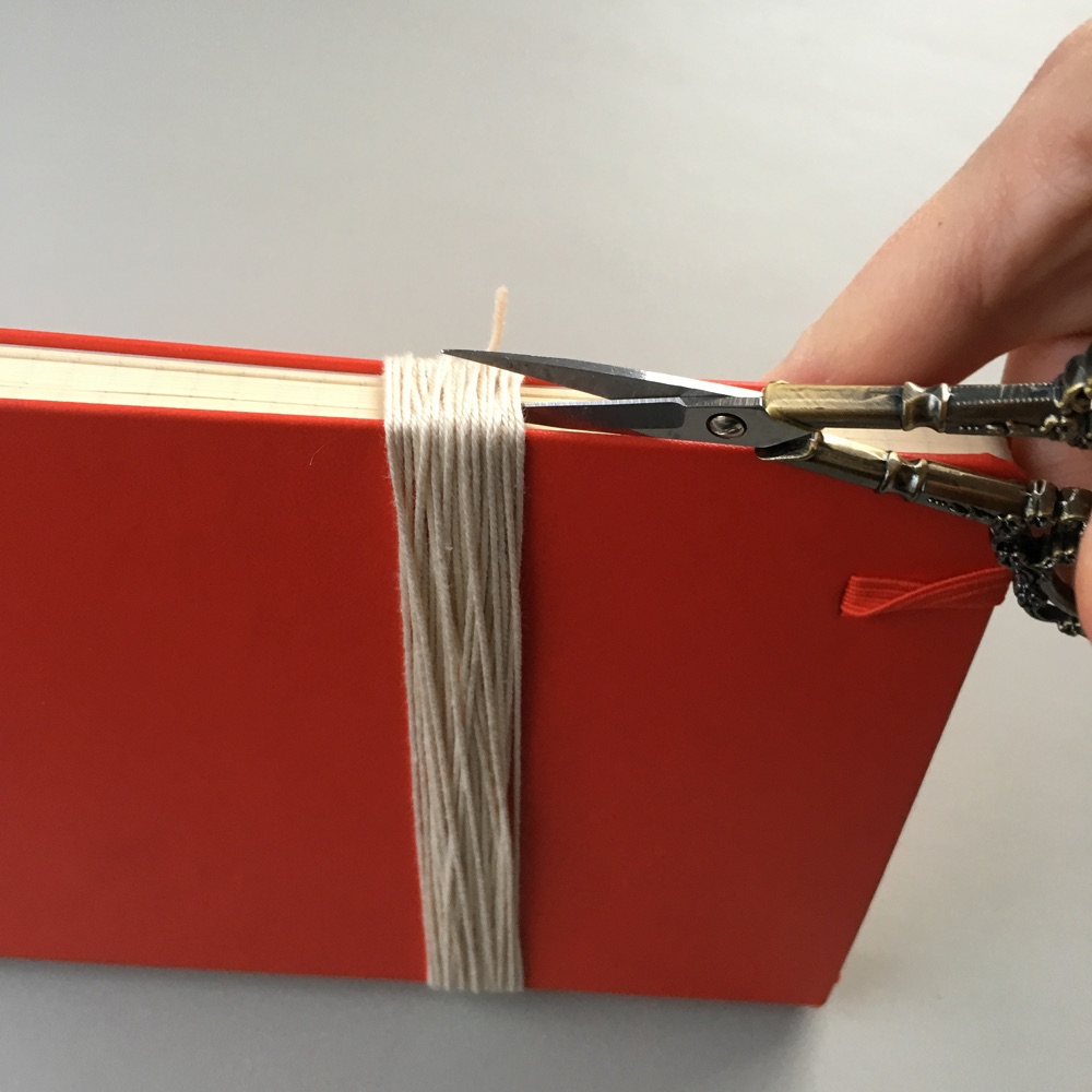Klipp av garnet vid bokens sida