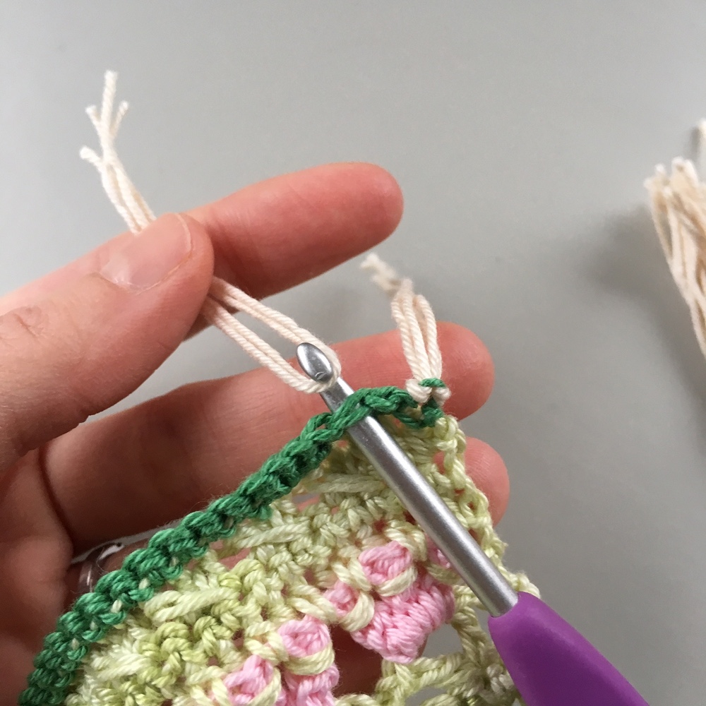 - Stick in virknålen från avigsidan på maskan där du vill fästa fransar.