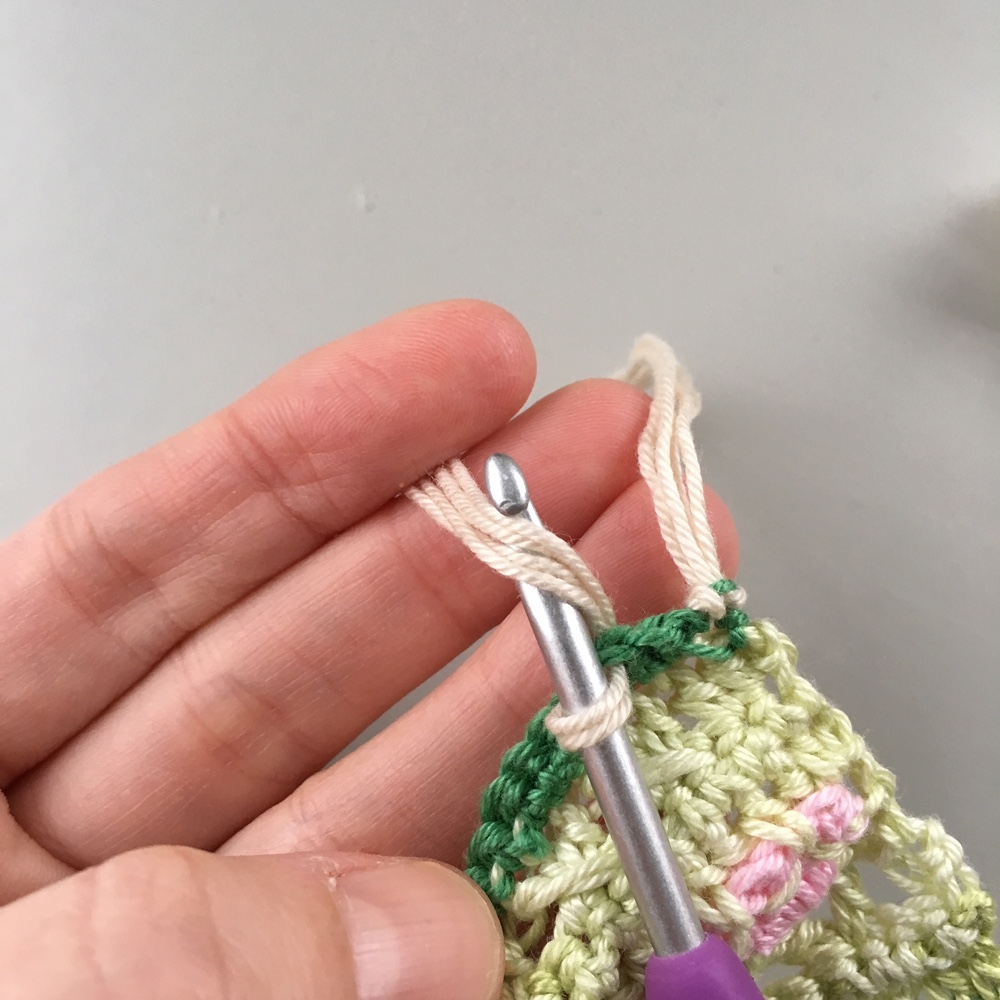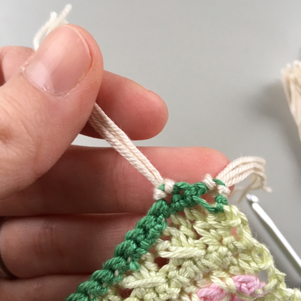 När du klippt till dina garnbitar fäster du dem 2 och 2 i varannan maska på båda kortsidor av duken. Det är enklast att använda en lite större virknål för att få fast fransarna. Gör så här: