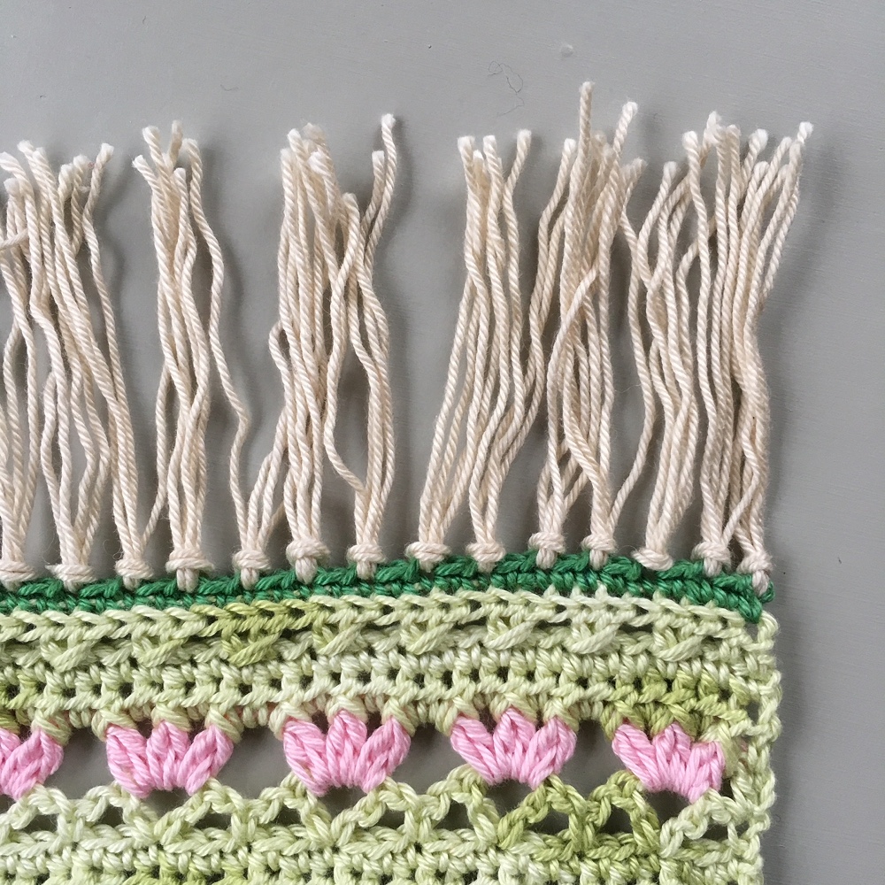 I den här sista delen lägger vi till ännu en rand med blommor och avslutar med att göra fina fransar i båda ändar.
