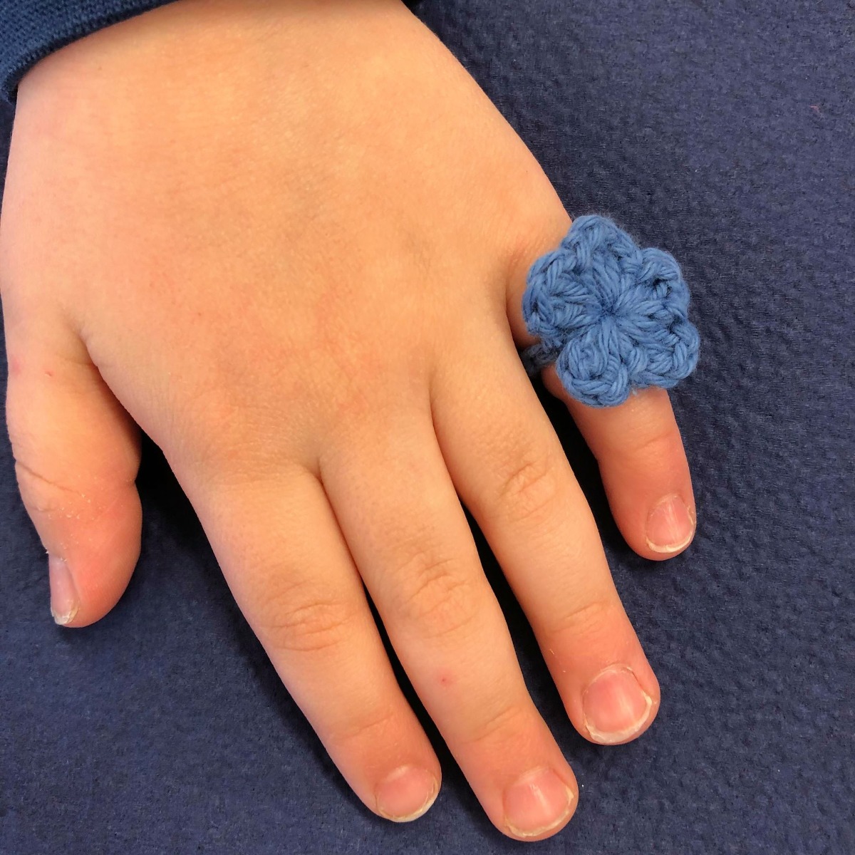 Virka om magisk ring (ca 15cm lång garnända) *1 smygmaska, 1 luftmaska, 2 stolpar, 1 luftmaska* x 5, 1 smygmaska. Dra åt magiska ringen och virka med båda garnändarna 8-10 luftmaskor så det blir lagom runt ett litet finger. Fäst på undersidan så att det blir till en liten ring.