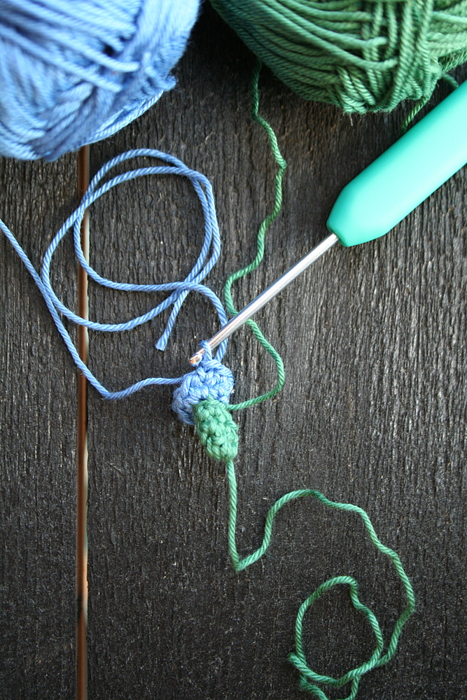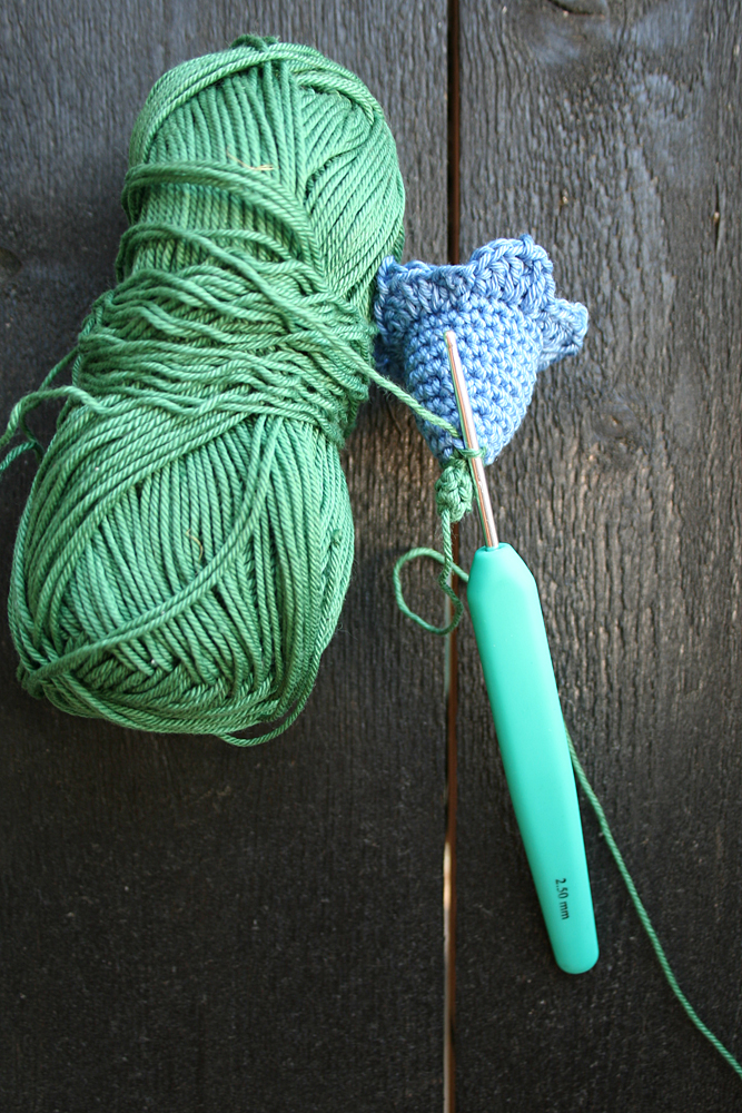 Varv 2-3: Virka fm i fm. Byt till blått garn i sista genomdraget på sista fm. OBS! Ta inte av den gröna tråden, låt den hänga på utsidan av blomman till senare.