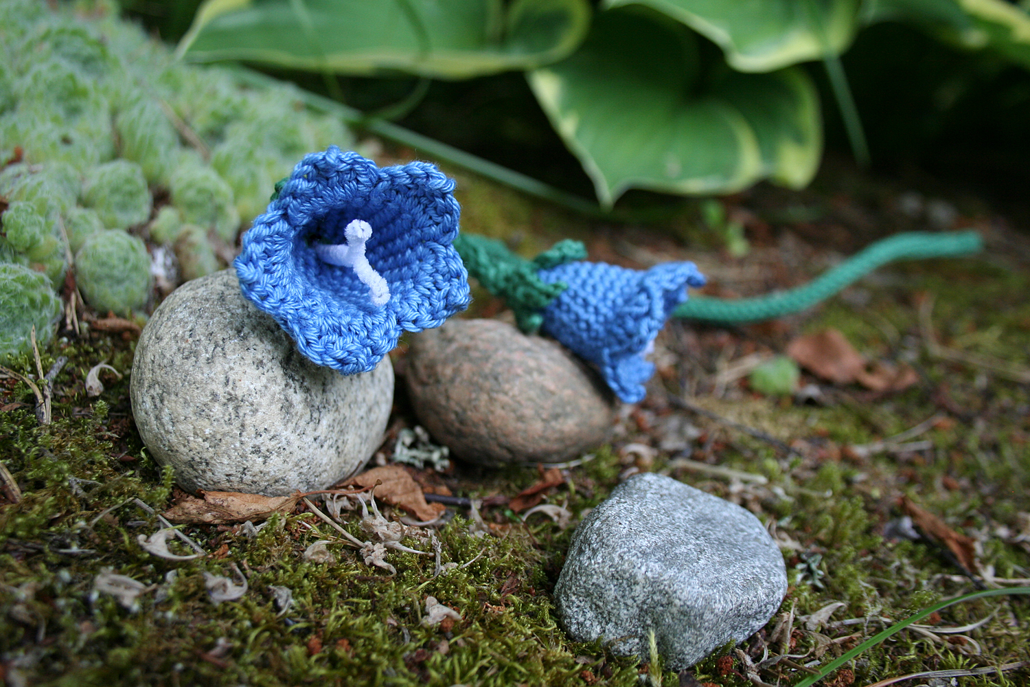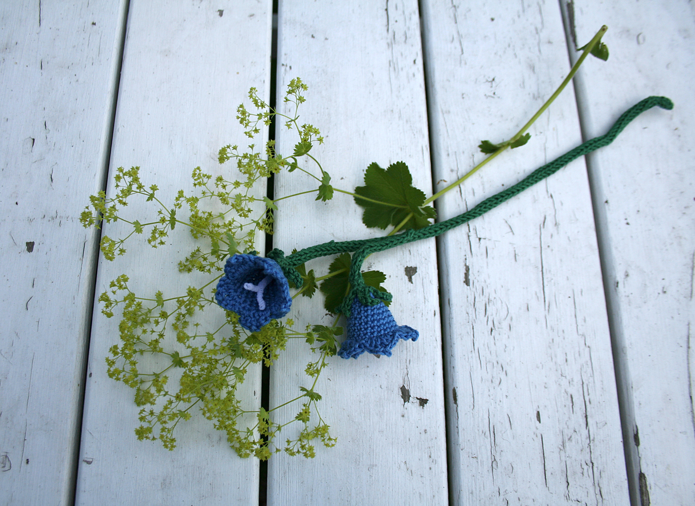 Trä in en ståltråd i stjälkarna. Se till att den även går in i blåklockan, böj till den där inne så den stannar kvar. Ståltråden i de kortare stjälkarna sticker du in i den längsta i-corden. Sy fast i-corden i den långa i-corden.