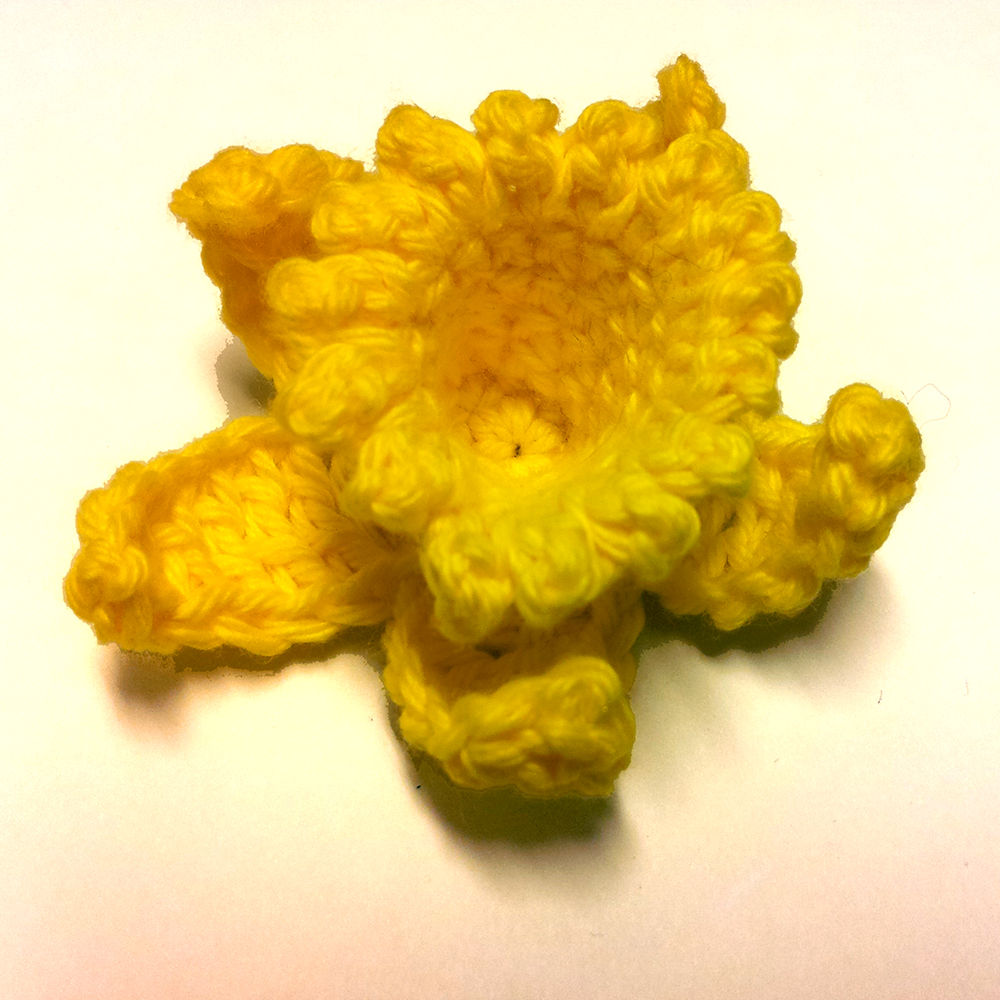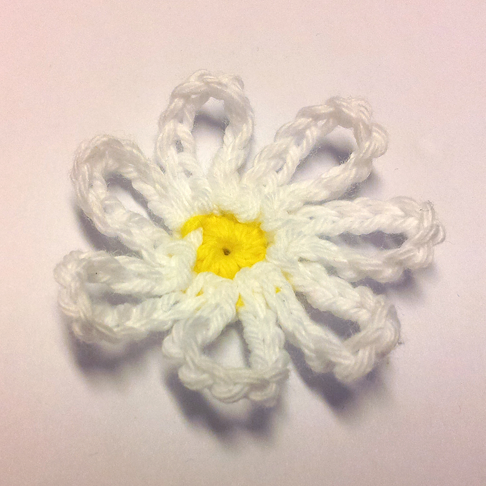 Varv 2: Med vitt garn: 1 sm i valfri fm, *10 lm, 1 sm i samma fm, 1 sm i nästa fm*, upprepa *-* varvet runt (= 7 kronblad).