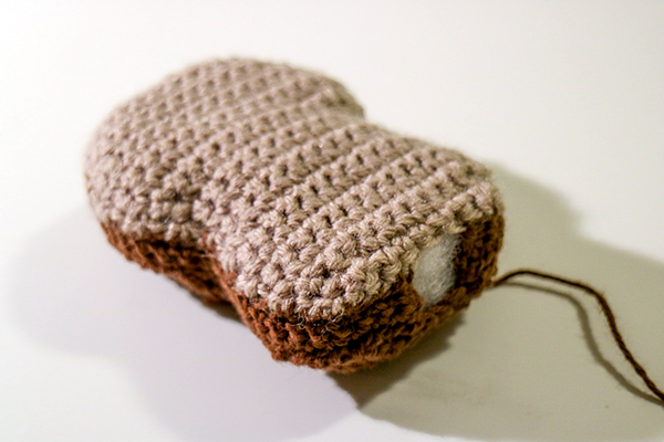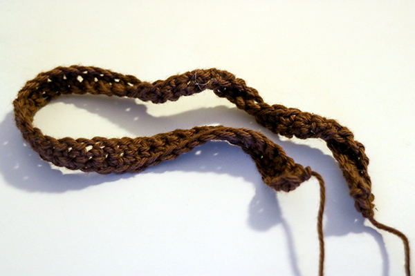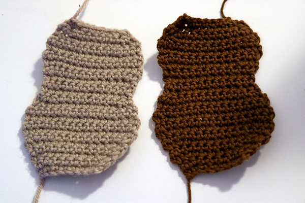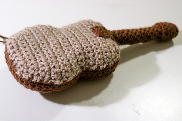 De här delarna virkas nerifrån och upp. Alltså börjar du med gitarrens tjockare del och fortsätter uppåt till midjan och sedan överdelen. Gör två stycken, en ljusbrun och en mörkbrun.