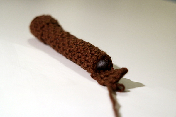 Sy fast ljudhålet och stallet som på bilden. Använd mörkbrunt garn för att sy täta kaststygn runt hålet, eller något annat mönster.
