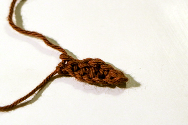 Varv 6: Virka detta varv i den inre maskbågen. Virka (1 fm, 2 fm tills) 4 ggr = 8 fm.