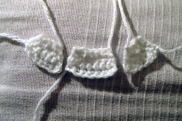 Varv 3: Virka 1 lm, vänd, virka 2 fm tills, 1 fm i de följande 3 fm, virka 2 fm tills = 5 fm