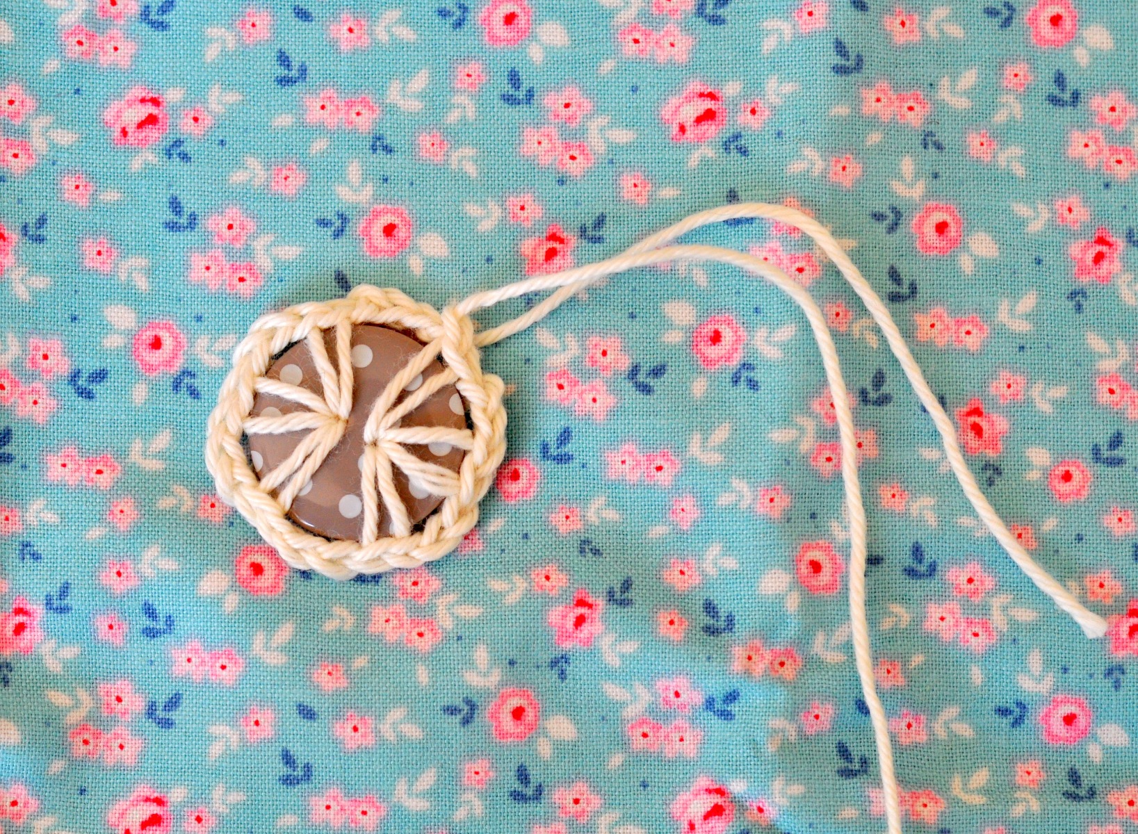 *Virka 3 lm, 1 fm med nedtag i knappens 1:a hål (använd den tunnare virknålen till detta)*, upprepa från *-* ytterligare 2 ggr, *virka 3 lm, 1 fm med nedtag i knappens 2:a hål*, upprepa från *-* ytterligare 2 ggr, 1 sm i varvets 1:a lm. Ta av garnet och dra igenom.