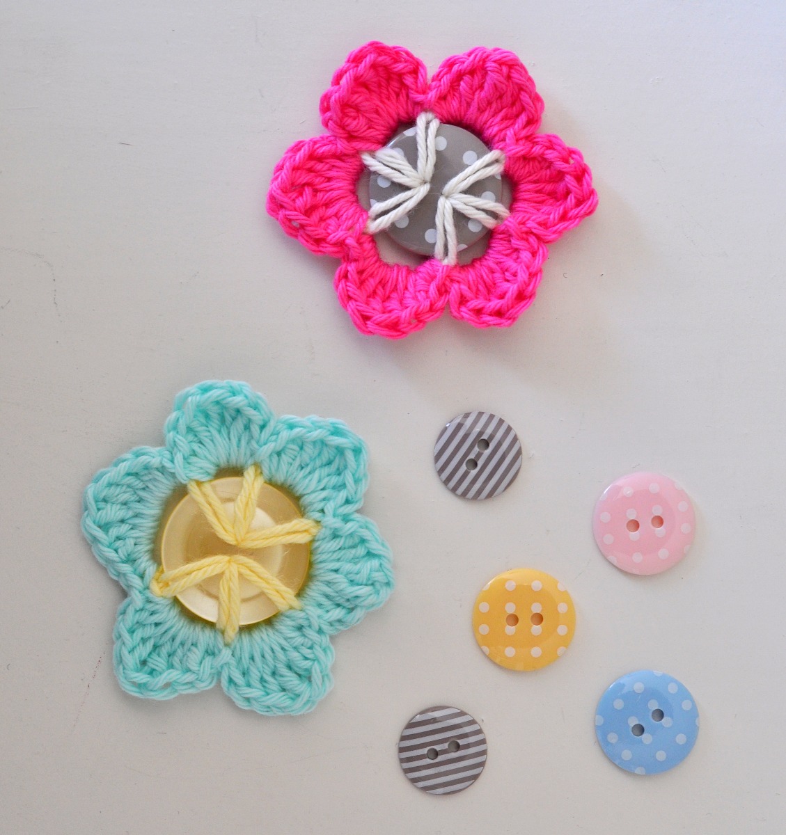 Material: Minst 2 olika färger av Minibomull, virknål nr 2,5 att virka med samt nr 1,5 för att dra garnet genom hålen, knappar (minst 20 mm i diameter med 2 hål).