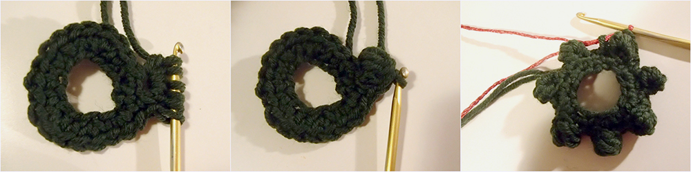 Varv 3: Virka 1 fm, virka (1 puffmaska av 5 stolpar i bakre maskbågen, 1 fm i nästa två fm) 7 ggr, hoppa över sista fm efter den sista puffmaskan.