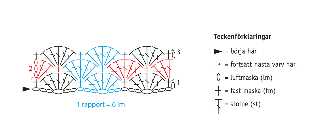 Varv 2: 3 lm (= 1:a st), 2 st i 1:a fm, hoppa över 2 st, 1 fm i nästa st, hoppa över 2 st, *5 st i nästa fm, hoppa över 2 st, 1 fm i nästa st, hoppa över 2 st* upprepa *-* till 1 fm återstår, 3 st i sista fm, vänd.