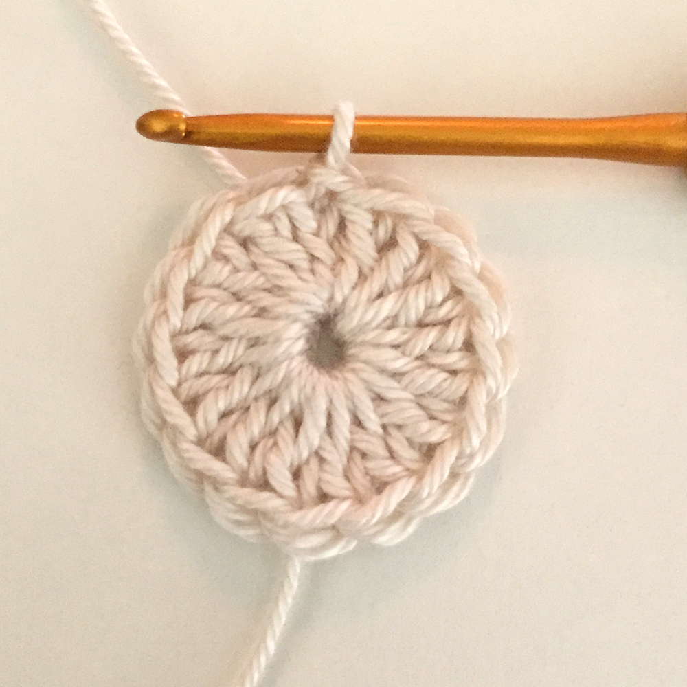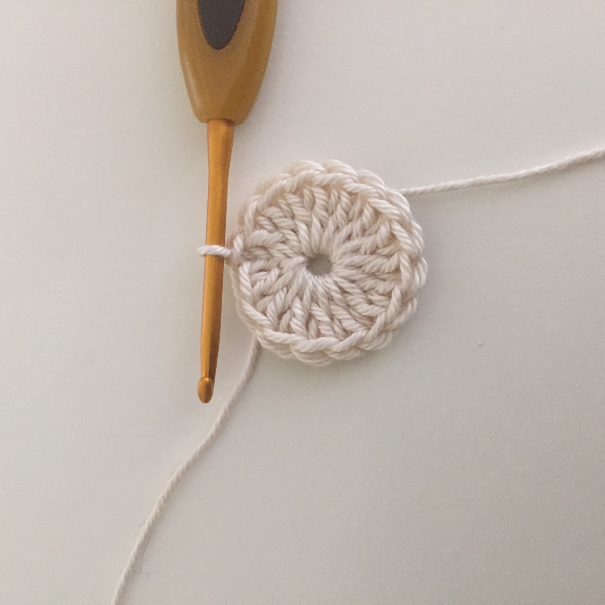 Varv 1: Gör en magisk ring med 3 lm, 15 st, avsluta med 1 sm i 3:e lm.